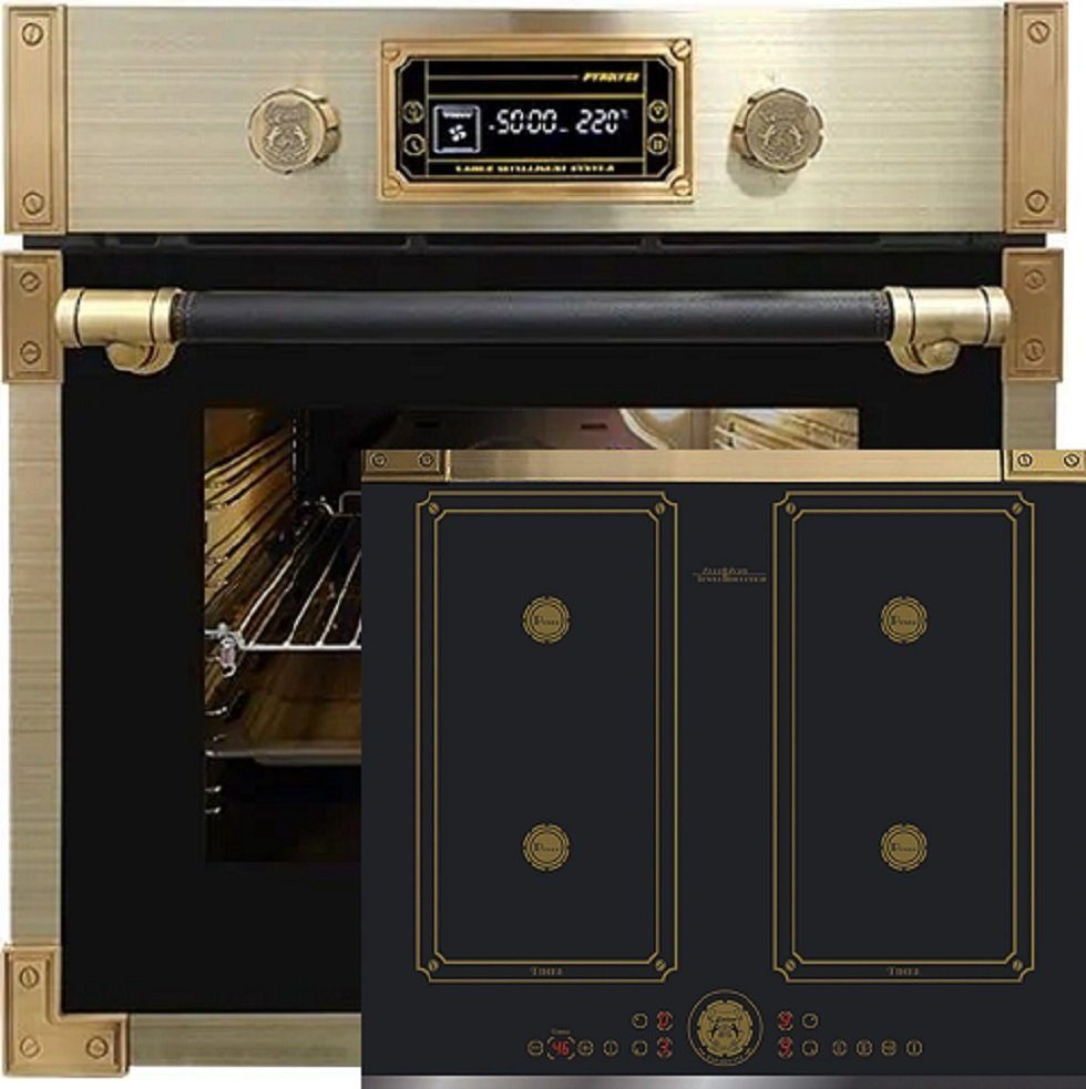 Die flachen einteiligen Kochfelder mit leicht abgeschrägten Kanten und einer Facette vorne verfügen über ein elegantes Design mit zahlreichen Art Déco Dekorelementen wie die Beschläge aus massivem Metall der Antik-Goldtönen, das Ihrer Küche einen exklusiven Stil verleiht.