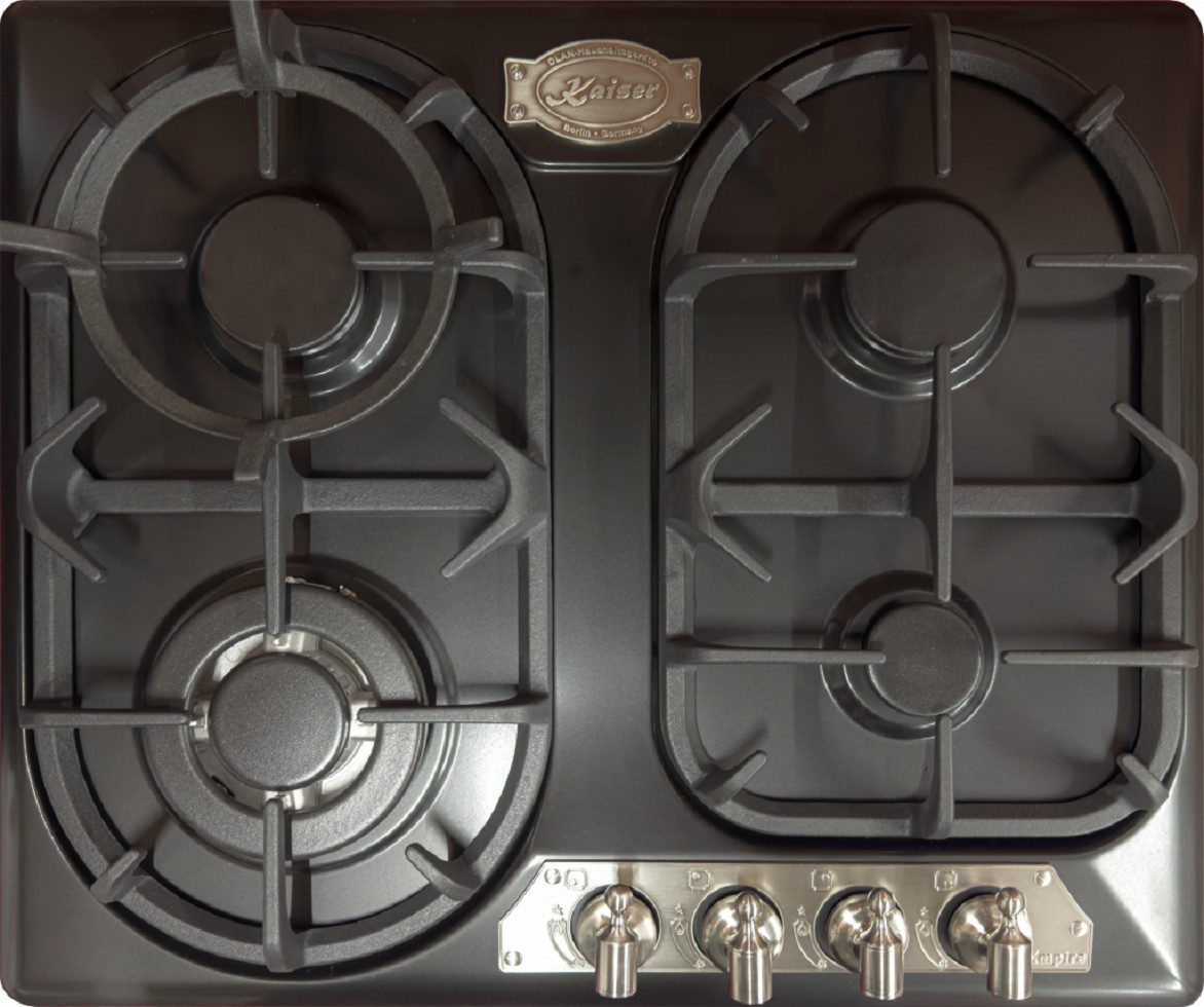 Top-Features | Emaille-Farbe Anthrazit / Dekor – massives Metall Silber Emailliertes Gaskochfeld mit Metallelementen Silber 4 Gasbrenner, davon 1 Turbo – Gasbrenner |