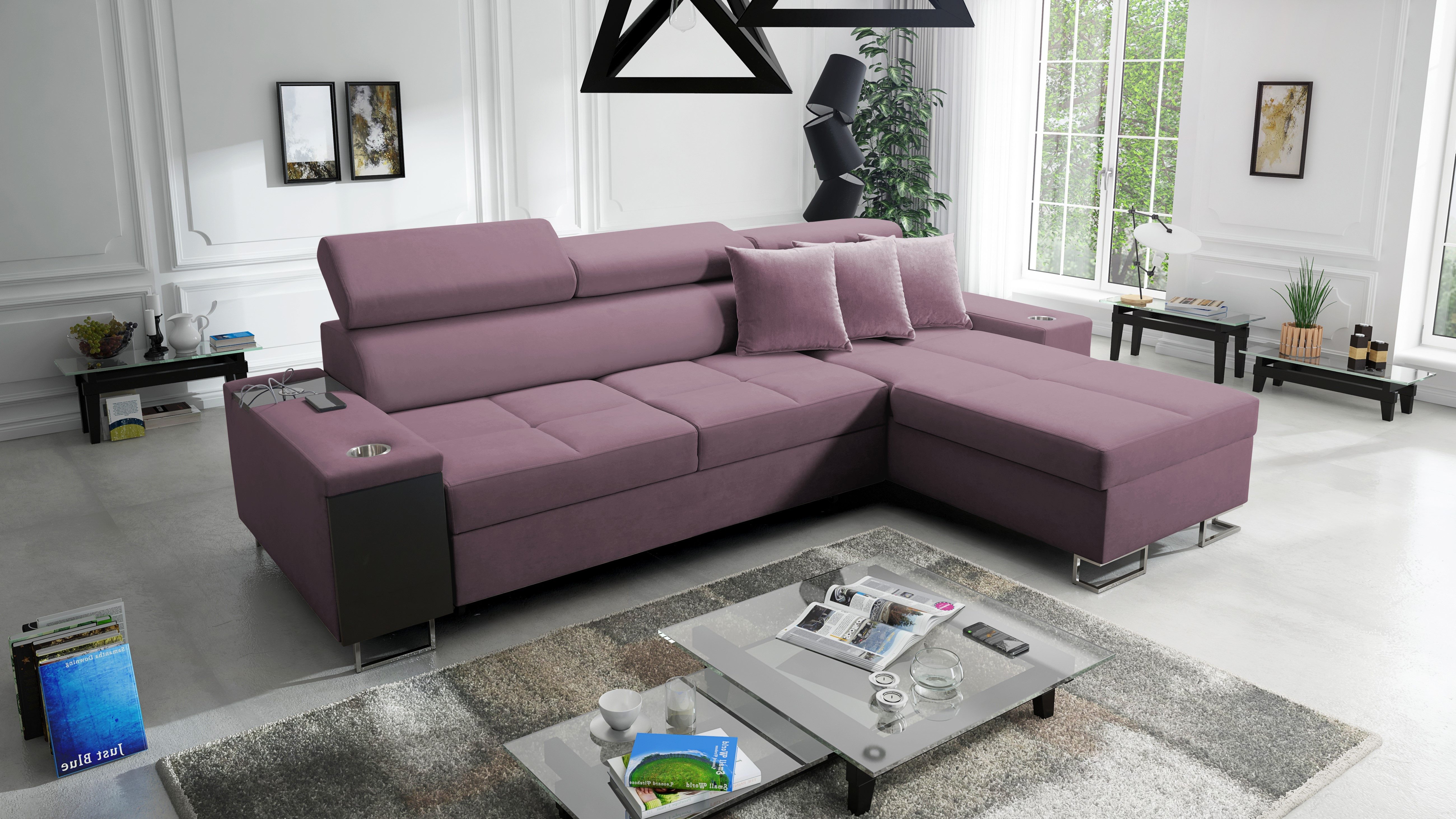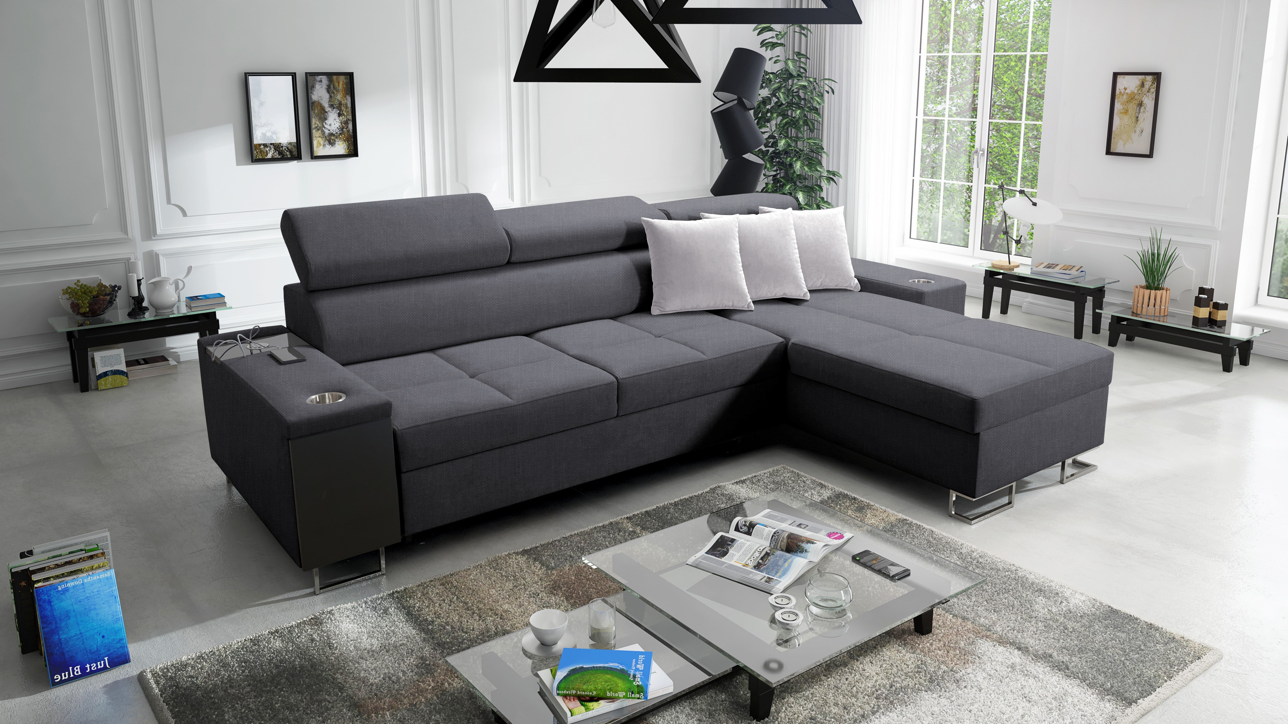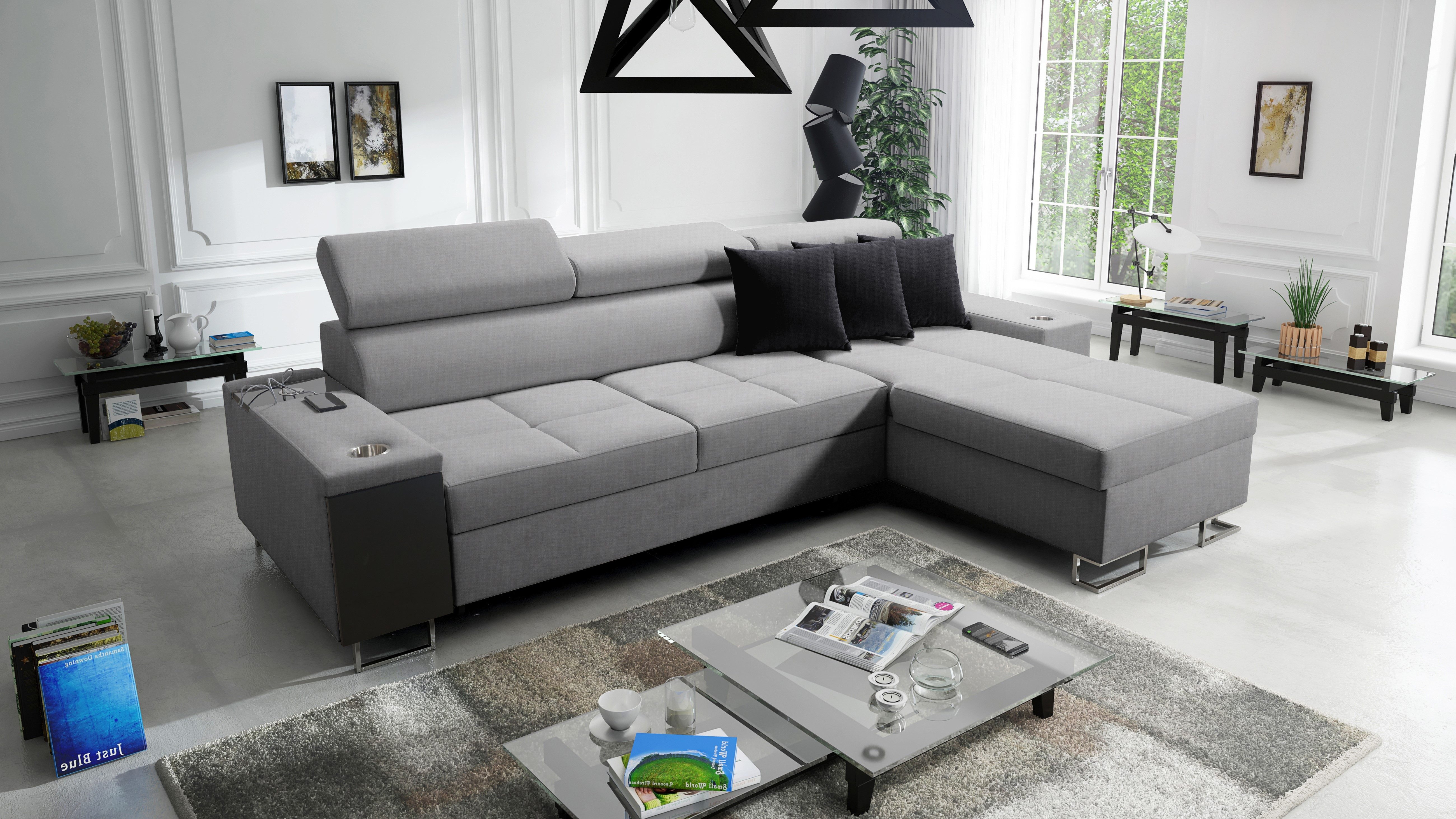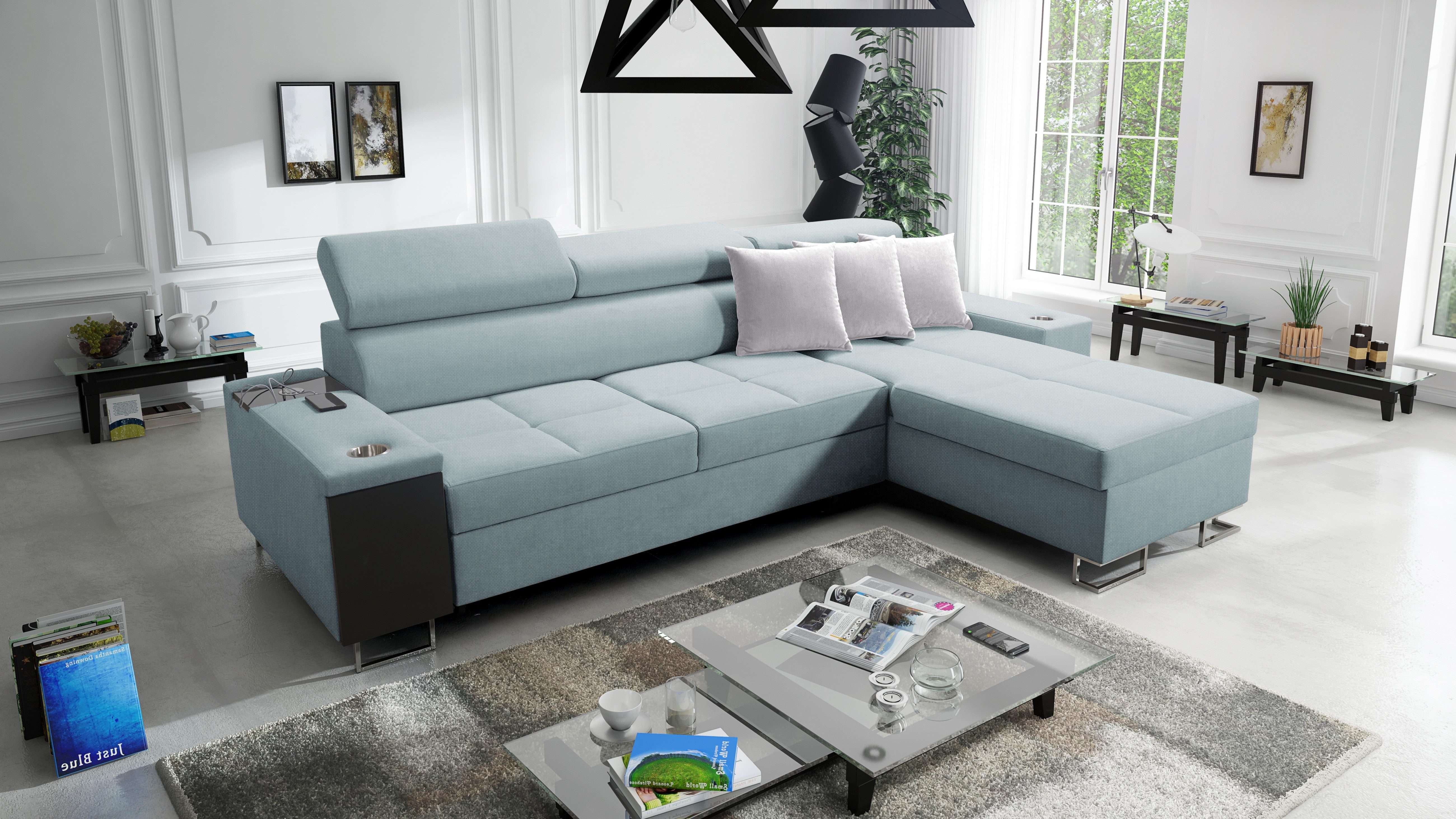 Das Ecksofa MORENA I MINI mit Schlaffunktion und Bettkasten o ist ein ideales Angebot für eine große Familie. Die optimal bemessenen Sitzflächen sind mit einer verlängerten Liegefläche kombiniert und bieten sowohl einen bequemen Sitzplatz als auch einen komfortablen Platz zum Entspannen in halbsitzender und liegender Position. Das Entspannen nach einem arbeitsreichen Tag wird auch durch die verstellbaren Kopfstützen erleichtert, so dass Sie beim Ausruhen eine bequeme Position einnehmen können. Dieses Ecksofa wurde mit viel Liebe zu Eleganz und Modernität entworfen. Das geräumige Sofa hat eine Schlaffunktion. Im ausgeklappten Zustand bietet es gute Bedingungen für den täglichen Schlaf und löst dank des Bettzeugbehälters das Problem der Aufbewahrung von Bettdecken, Kissen und warmen Decken. Das moderne Ecksofa MORENA I MINI hat eine eingebaute Bar an der Seite. Diese praktische Ablage ist ideal für faule Nachmittage, da man die darin gestapelten Getränke, elektronischen Geräte und kürzlich gelesenen Zeitungen leicht erreichen kann. Ein weiterer Pluspunkt des Ecksofas mit Bar ist die eingebaute Steckdose und der USB-Eingang, so dass Sie Ihr Handy oder Ihren Computer auf dem Schoß haben und gleichzeitig aufladen können. Die sorgfältig ausgewählten Polstermaterialien und die solide Sitzfüllung - gewellte Federn kombiniert mit HR35-Schaumstoff - sorgen für eine außergewöhnliche Weichheit und Polsterung, die den Körper beim Entspannen gut stützt. Die solide Konstruktion des Holzrahmens mit einer Spanplattenkombination gewährleistet eine lange Lebensdauer. Das Ecksofa ist in einer Vielzahl von Stoffen und vielen Farbpaletten erhältlich.