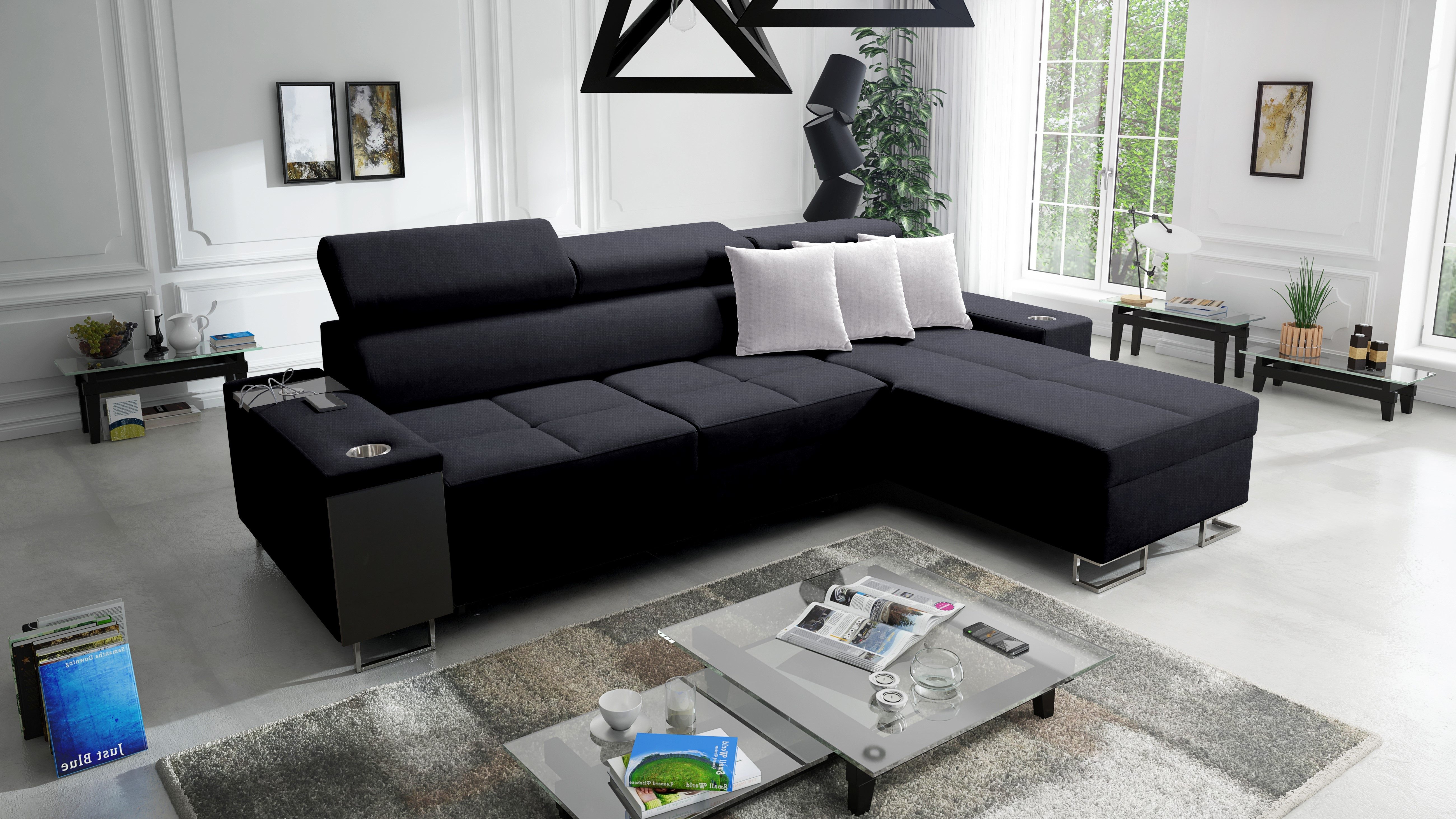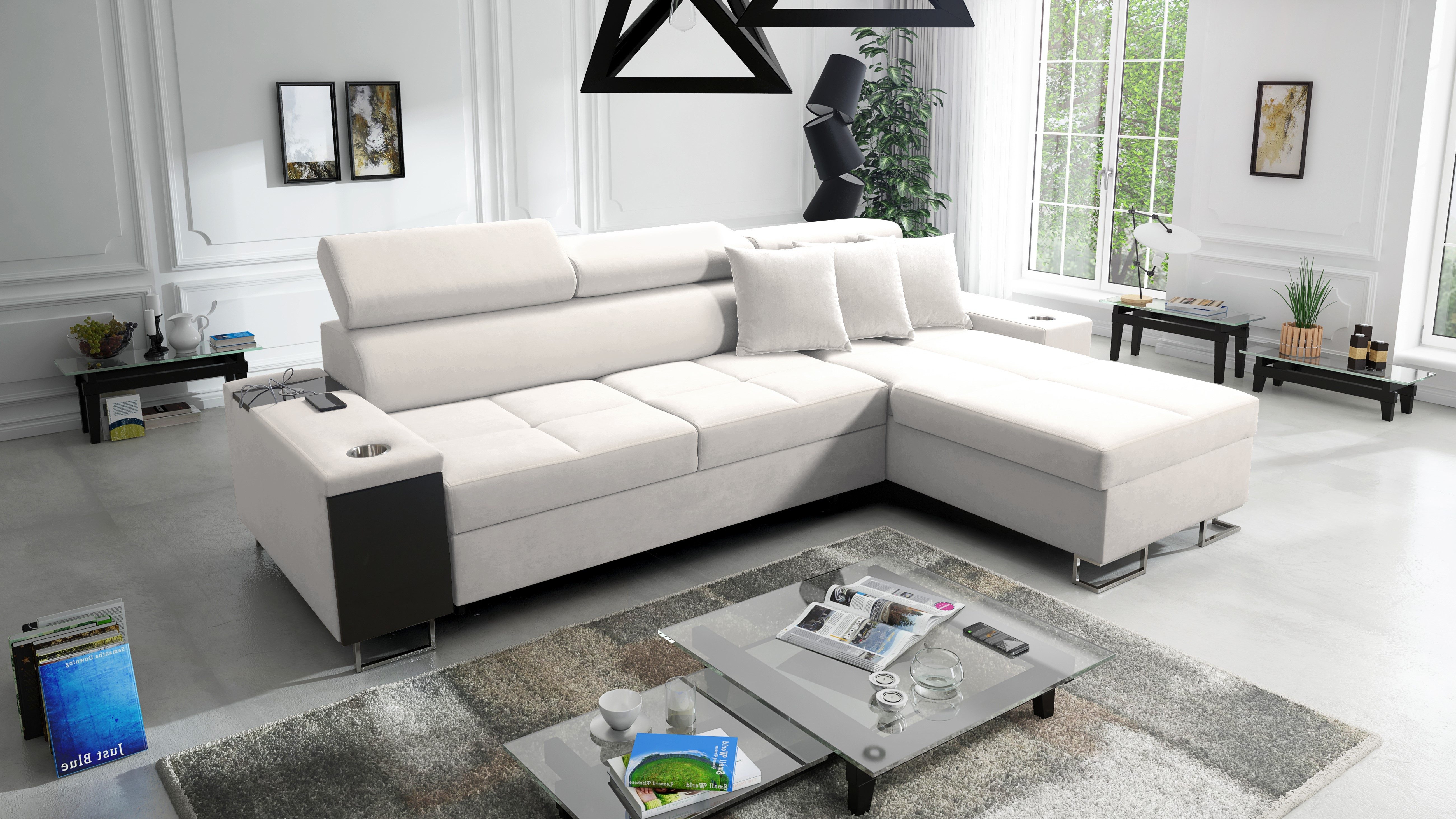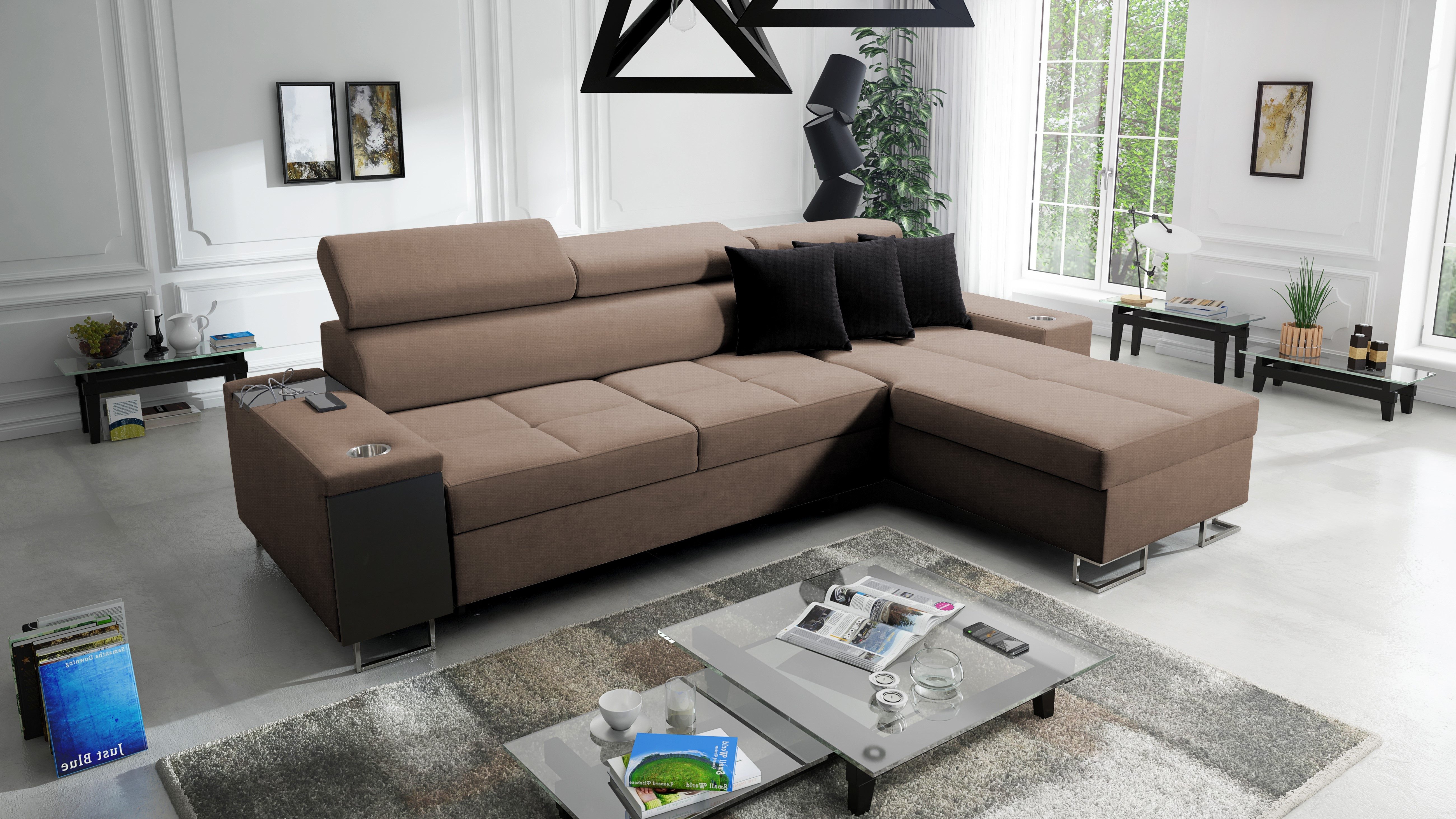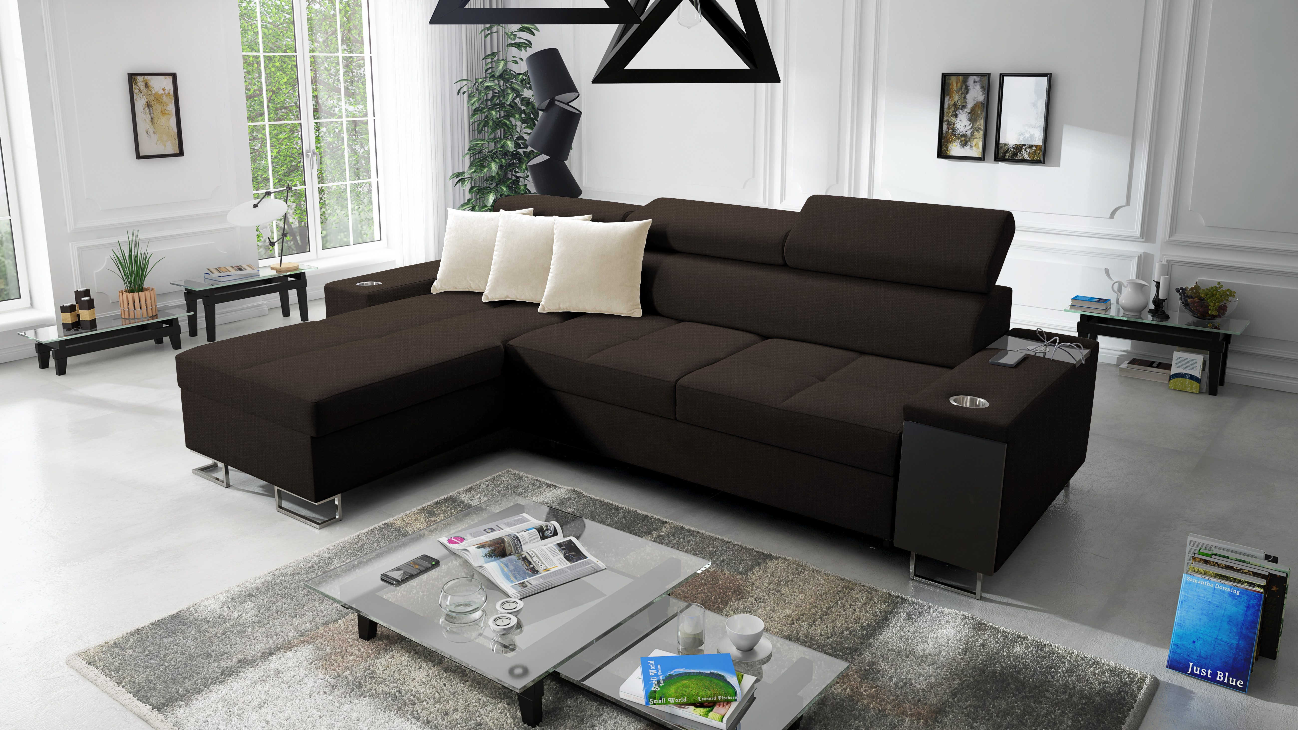 Das Ecksofa MORENA I MINI mit Schlaffunktion und Bettkasten o ist ein ideales Angebot für eine große Familie. Die optimal bemessenen Sitzflächen sind mit einer verlängerten Liegefläche kombiniert und bieten sowohl einen bequemen Sitzplatz als auch einen komfortablen Platz zum Entspannen in halbsitzender und liegender Position. Das Entspannen nach einem arbeitsreichen Tag wird auch durch die verstellbaren Kopfstützen erleichtert, so dass Sie beim Ausruhen eine bequeme Position einnehmen können. Dieses Ecksofa wurde mit viel Liebe zu Eleganz und Modernität entworfen. Das geräumige Sofa hat eine Schlaffunktion. Im ausgeklappten Zustand bietet es gute Bedingungen für den täglichen Schlaf und löst dank des Bettzeugbehälters das Problem der Aufbewahrung von Bettdecken, Kissen und warmen Decken. Das moderne Ecksofa MORENA I MINI hat eine eingebaute Bar an der Seite. Diese praktische Ablage ist ideal für faule Nachmittage, da man die darin gestapelten Getränke, elektronischen Geräte und kürzlich gelesenen Zeitungen leicht erreichen kann. Ein weiterer Pluspunkt des Ecksofas mit Bar ist die eingebaute Steckdose und der USB-Eingang, so dass Sie Ihr Handy oder Ihren Computer auf dem Schoß haben und gleichzeitig aufladen können. Die sorgfältig ausgewählten Polstermaterialien und die solide Sitzfüllung - gewellte Federn kombiniert mit HR35-Schaumstoff - sorgen für eine außergewöhnliche Weichheit und Polsterung, die den Körper beim Entspannen gut stützt. Die solide Konstruktion des Holzrahmens mit einer Spanplattenkombination gewährleistet eine lange Lebensdauer. Das Ecksofa ist in einer Vielzahl von Stoffen und vielen Farbpaletten erhältlich.