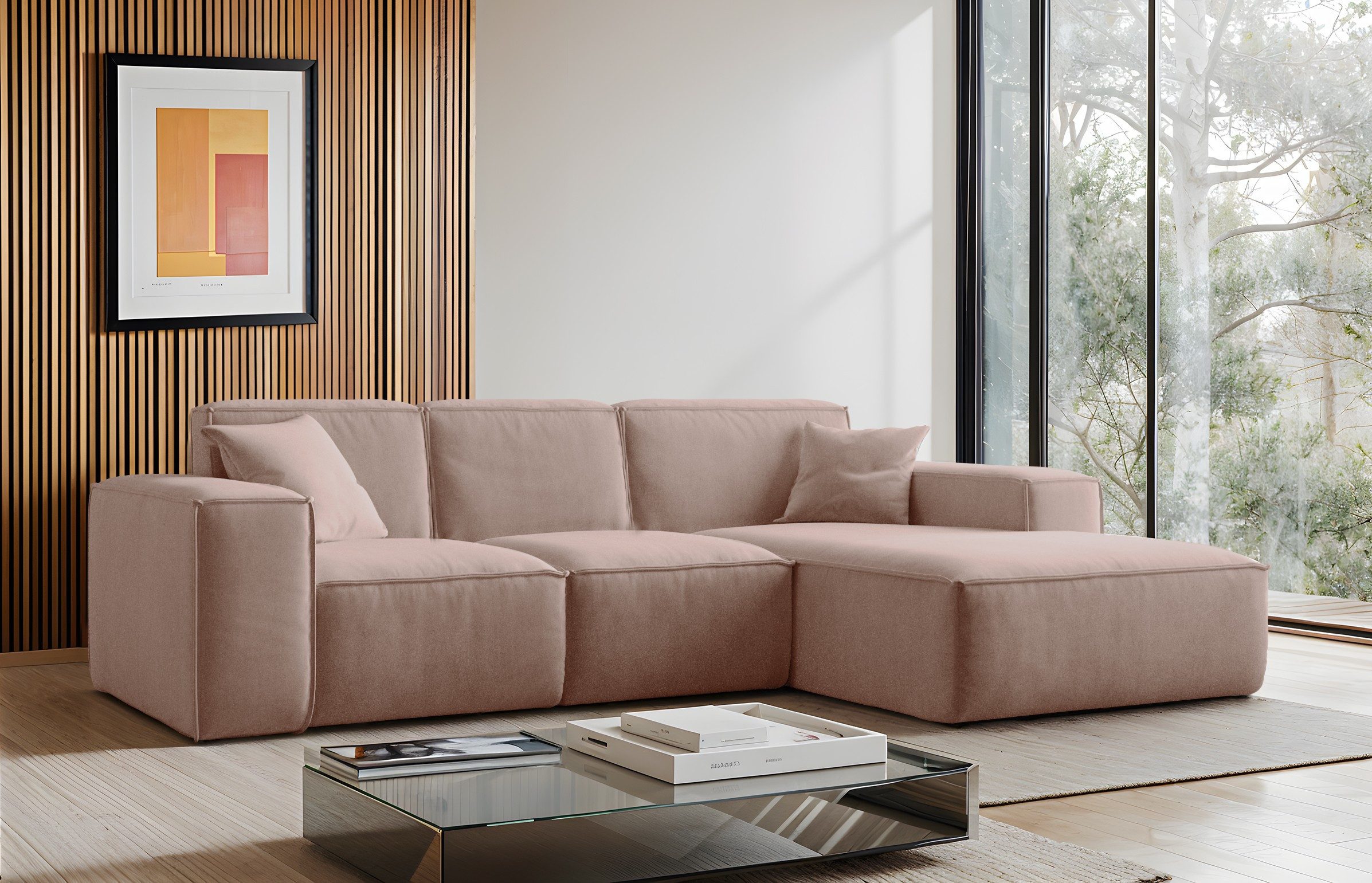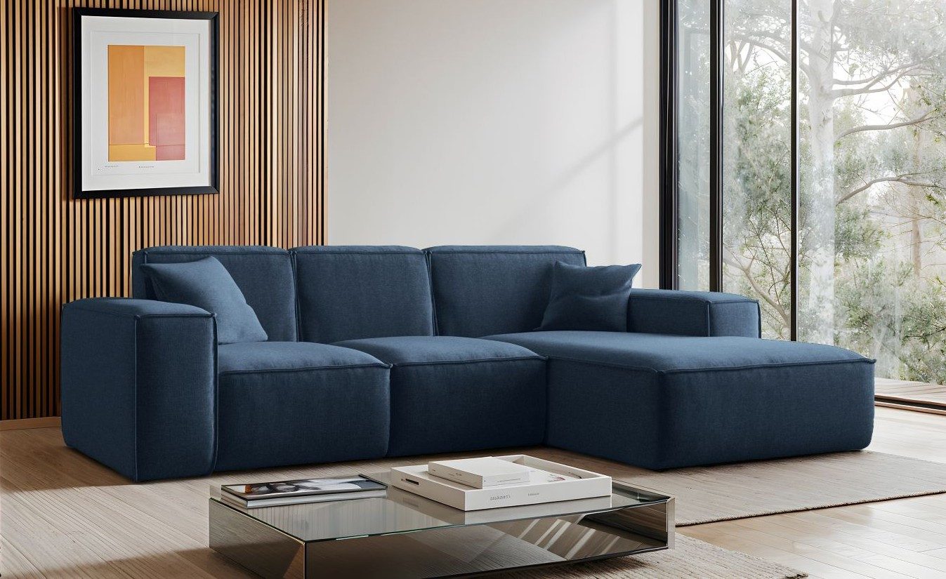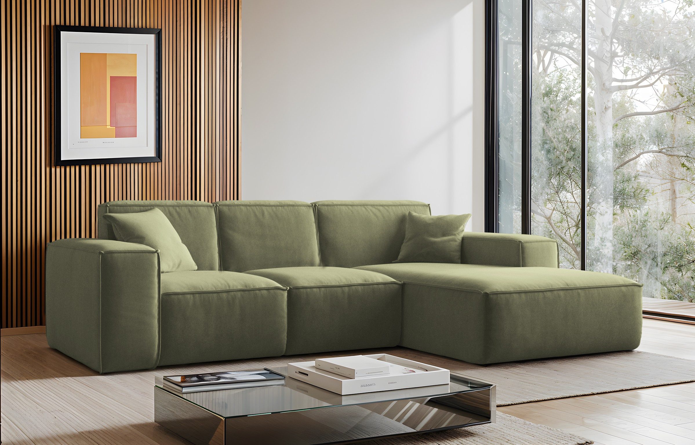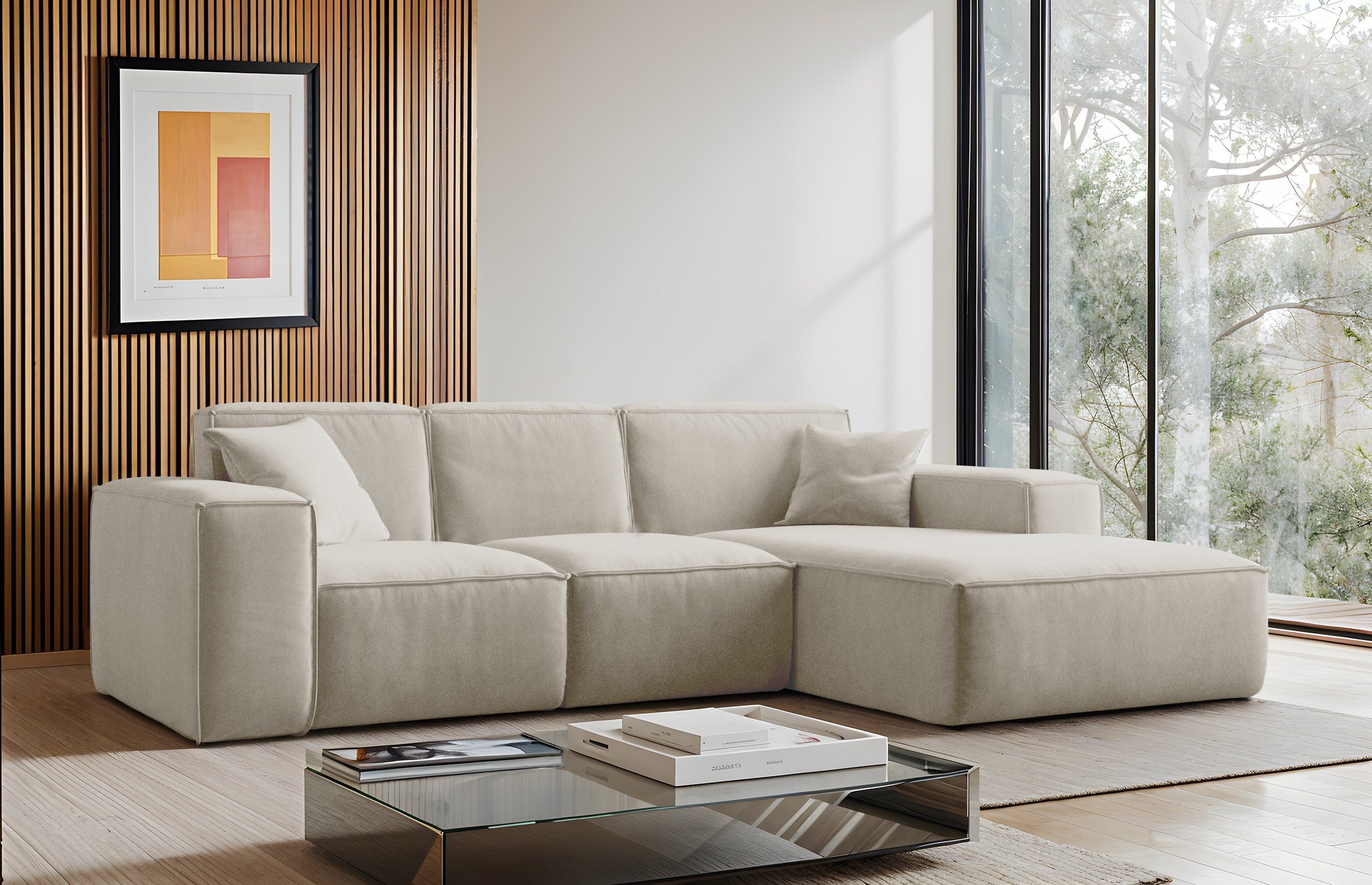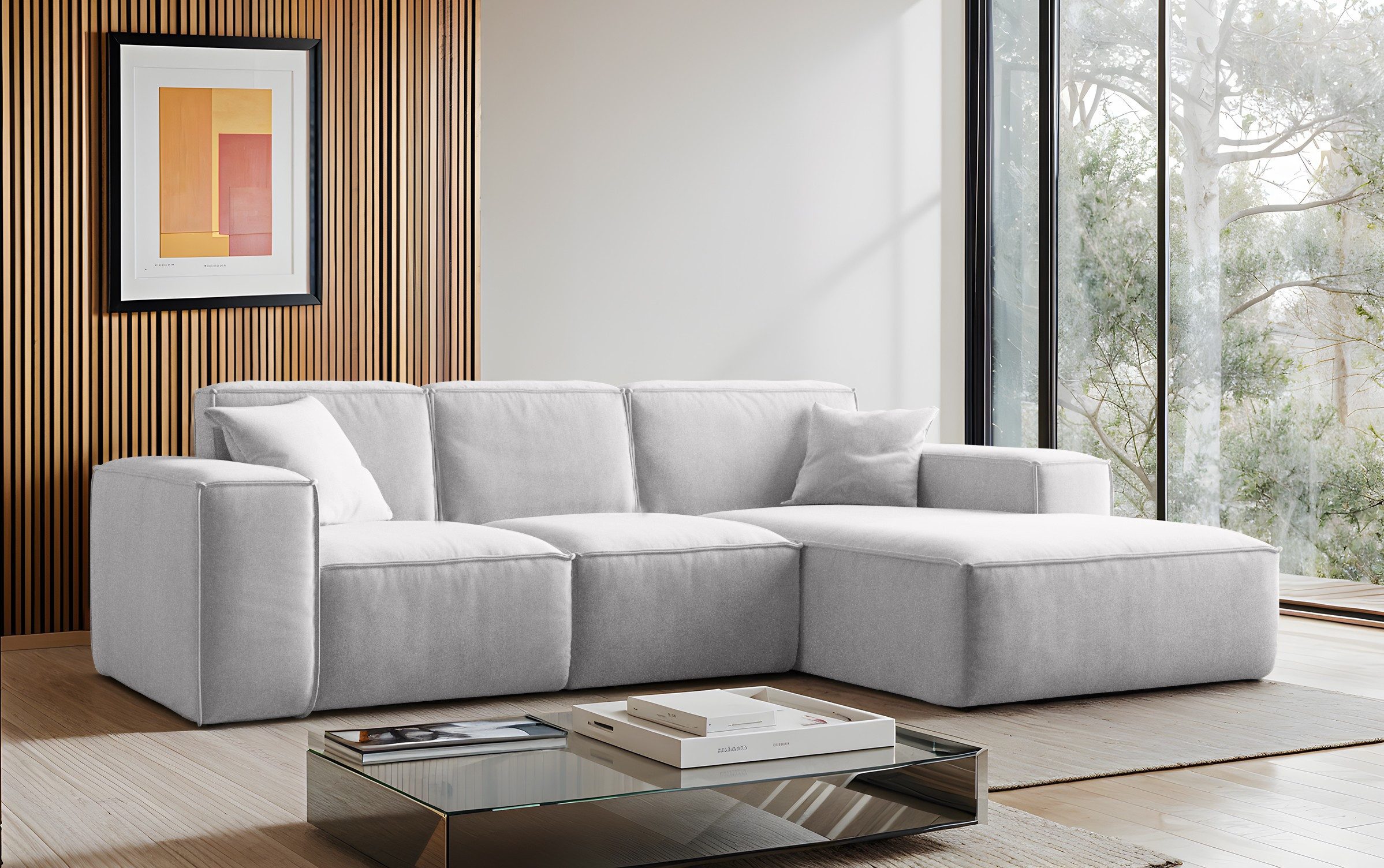 Ecksofa L-Form Sienaist ein Möbelstück, das Funktionalität, Eleganz und modernen Stil vereint. Siena ist die ideale Lösung für jedes Wohnzimmer. Dank des eleganten Designs bietet das Ecksofa in L-Form Siena nicht nur außergewöhnlichen Komfort, sondern auch eine einzigartige Ästhetik, die sich hervorragend mit modernen, minimalistischen oder skandinavischen Einrichtungsstilen kombinieren lässt. Das Möbelstück wurde mit Blick auf den täglichen Komfort entworfen. Die großzügige Sitzfläche und die hochwertigen Materialien gewährleisten langanhaltenden Komfort. Dazu ermöglicht seine L-förmige Konstruktion eine flexible Aufstellung und Anpassung an Räume unterschiedlicher Größe, sodass es sowohl in großzügigen als auch in kompakteren Wohnzimmern überzeugt. Feine Details wie dekorative Kissen und sorgfältig gearbeitete Kanten verleihen dem Möbelstück zusätzlichen Charme und unterstreichen die hohe Verarbeitungsqualität.