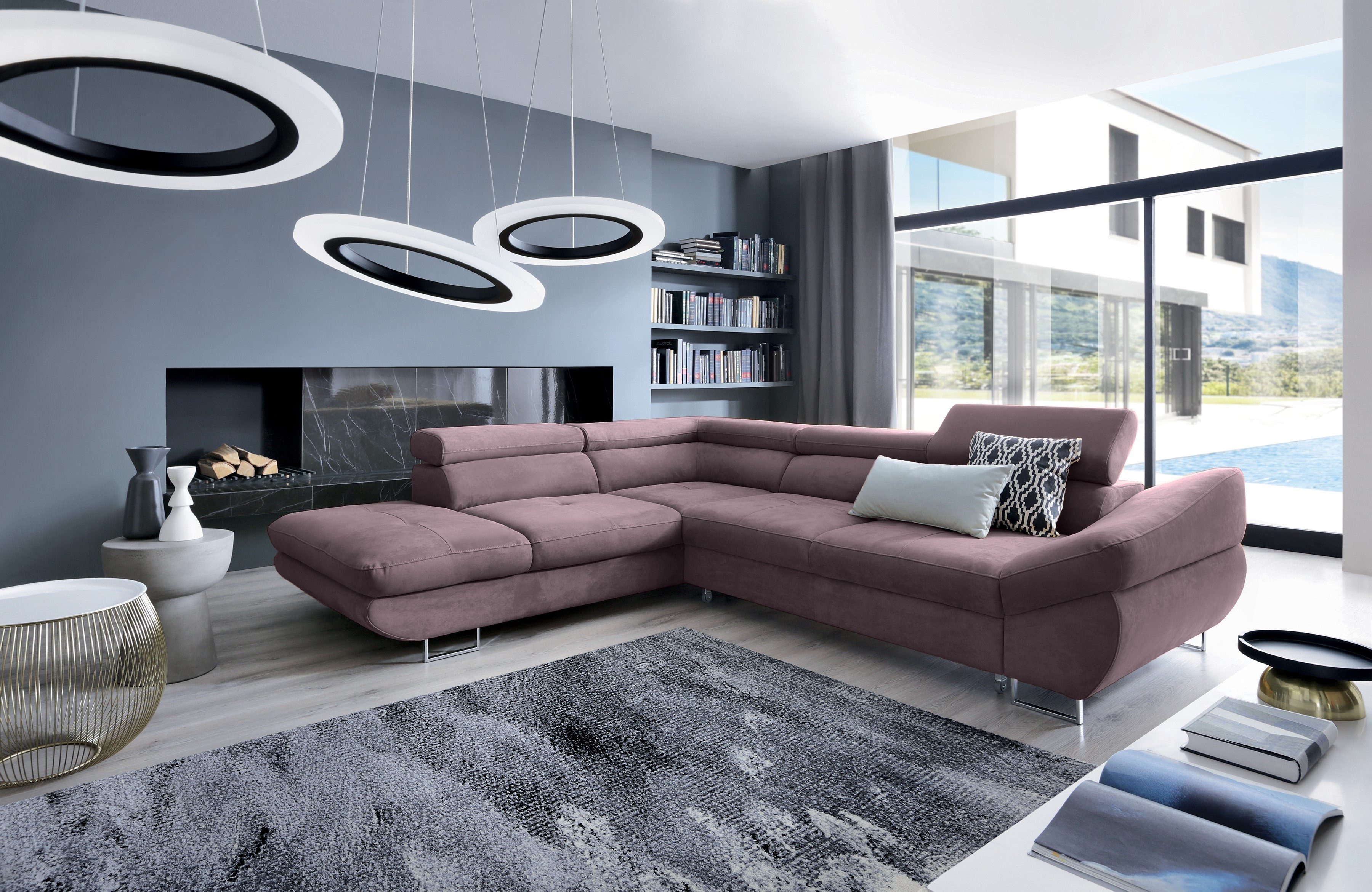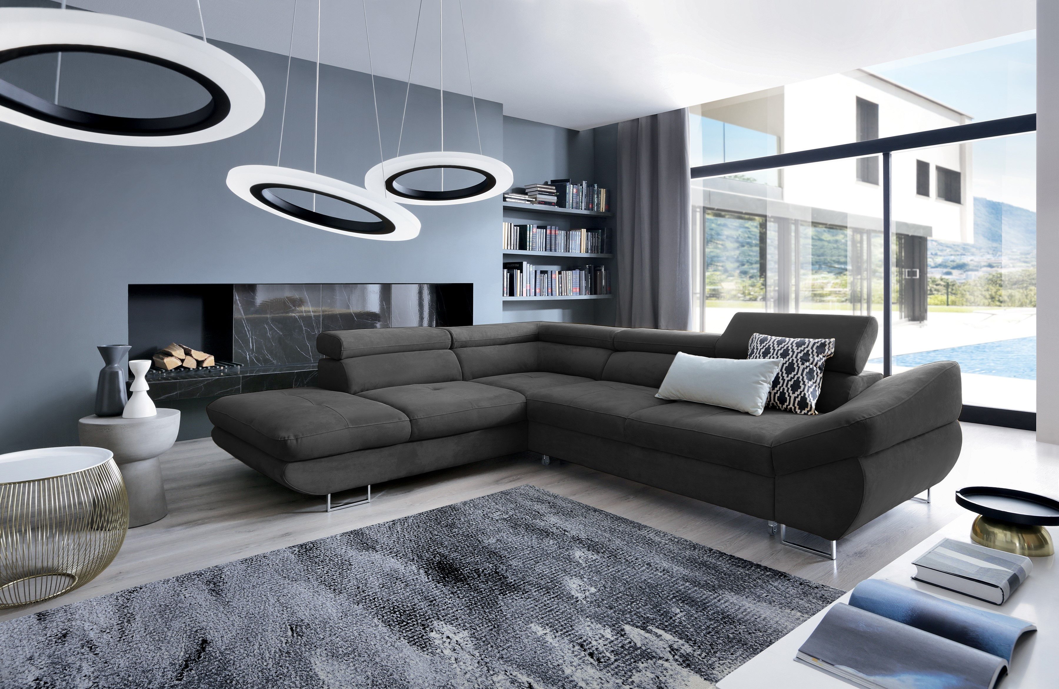Ecksofa Fabio ist von hoher Qualität und moderner Form mit ästhetischen Proportionen. Verstellbare Kopfstützen ermöglichen bequemes Ausruhen, die profilierte Armlehne bietet Ihnen die Möglichkeit, sich im Sitzen und Liegen auszuruhen. Chrombeine betonen die moderne Form. Die Schlaffunktion bietet die Möglichkeit, für zwei Personen zu schlafen, der Behälter für die Bettwäsche lässt sich öffnen und ist aus starkem, langlebigem Material gefertigt.