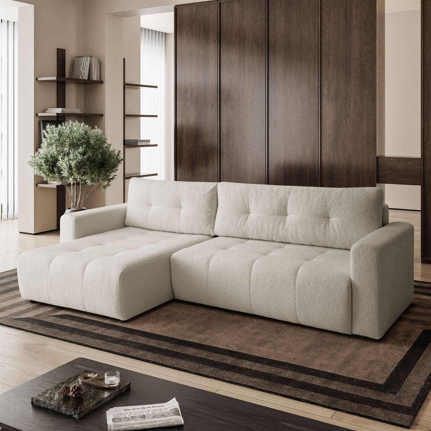 Das Ecksofa Vienna ist eine gute Wahl für alle, die die Harmonie zwischen Stil und Benutzerfreundlichkeit schätzen. Weiche Kissen, eine bequeme Sitzfläche und eine Schlaffunktion machen es zu einem multifunktionalen Möbelstück - ideal zum Faulenzen am Tag und zum Schlafen in der Nacht. Durch seine dezente Form und seine universelle Gestalt passt es sowohl zu modernen als auch zu klassischen Einrichtungen.