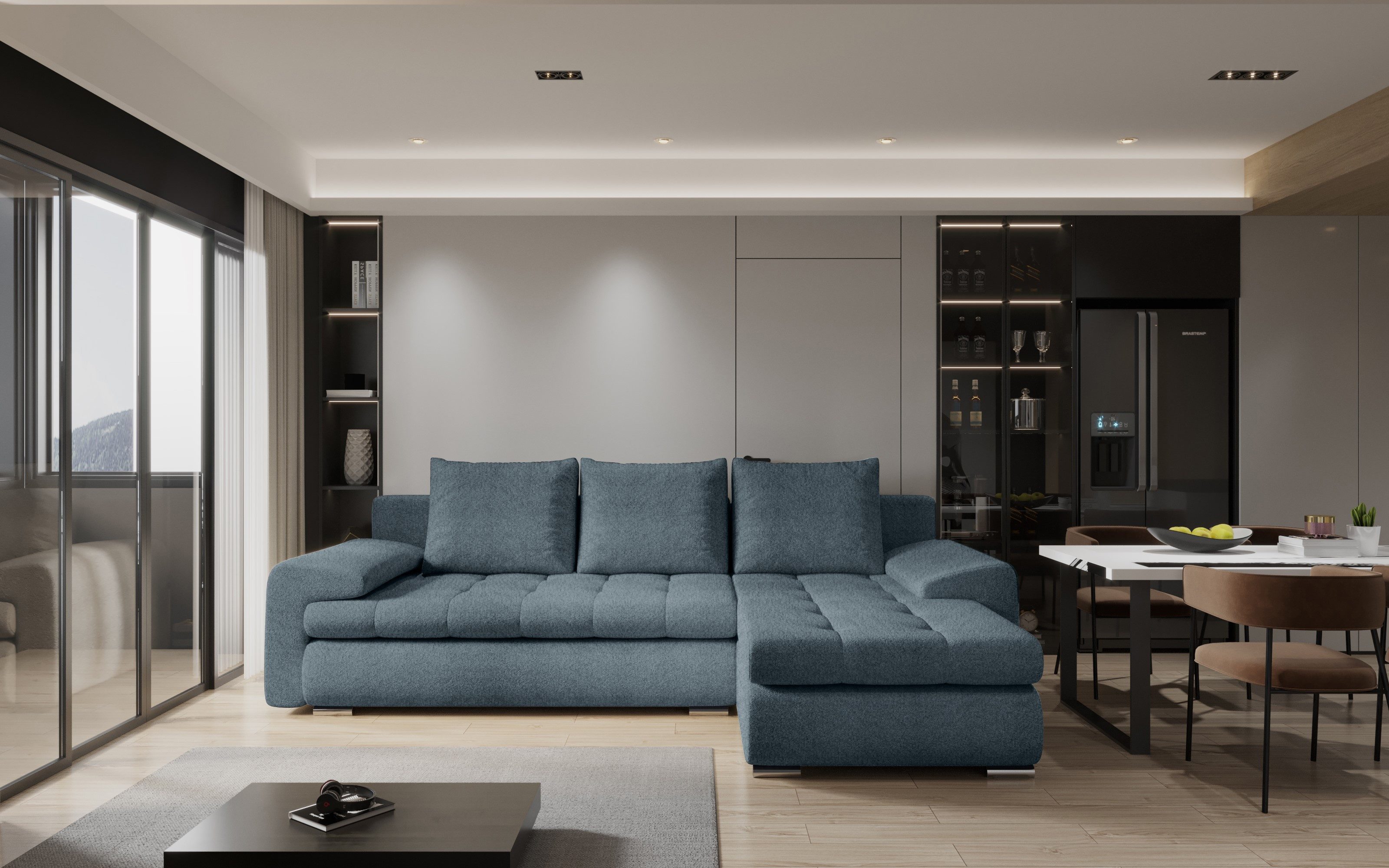 Benötigen Sie ein Ecksofa für Ihr Wohnzimmer, Ihren Raum oder vielleicht Ihr Arbeitszimmer, das ein Schmuckstück sein soll? Elegant und stilvoll? Wählen Sie das Ecksofa Tomi. Es ist ideal für größere Wohnzimmer und wird deren Einrichtung perfekt ergänzen. Die gesteppte Sitzfläche und die losen Kissen sind die Merkmale des eleganten und modernen Ecksofas. Die geräumige Sitzfläche bietet Platz für viele Gäste und sorgt für unglaublichen Komfort.