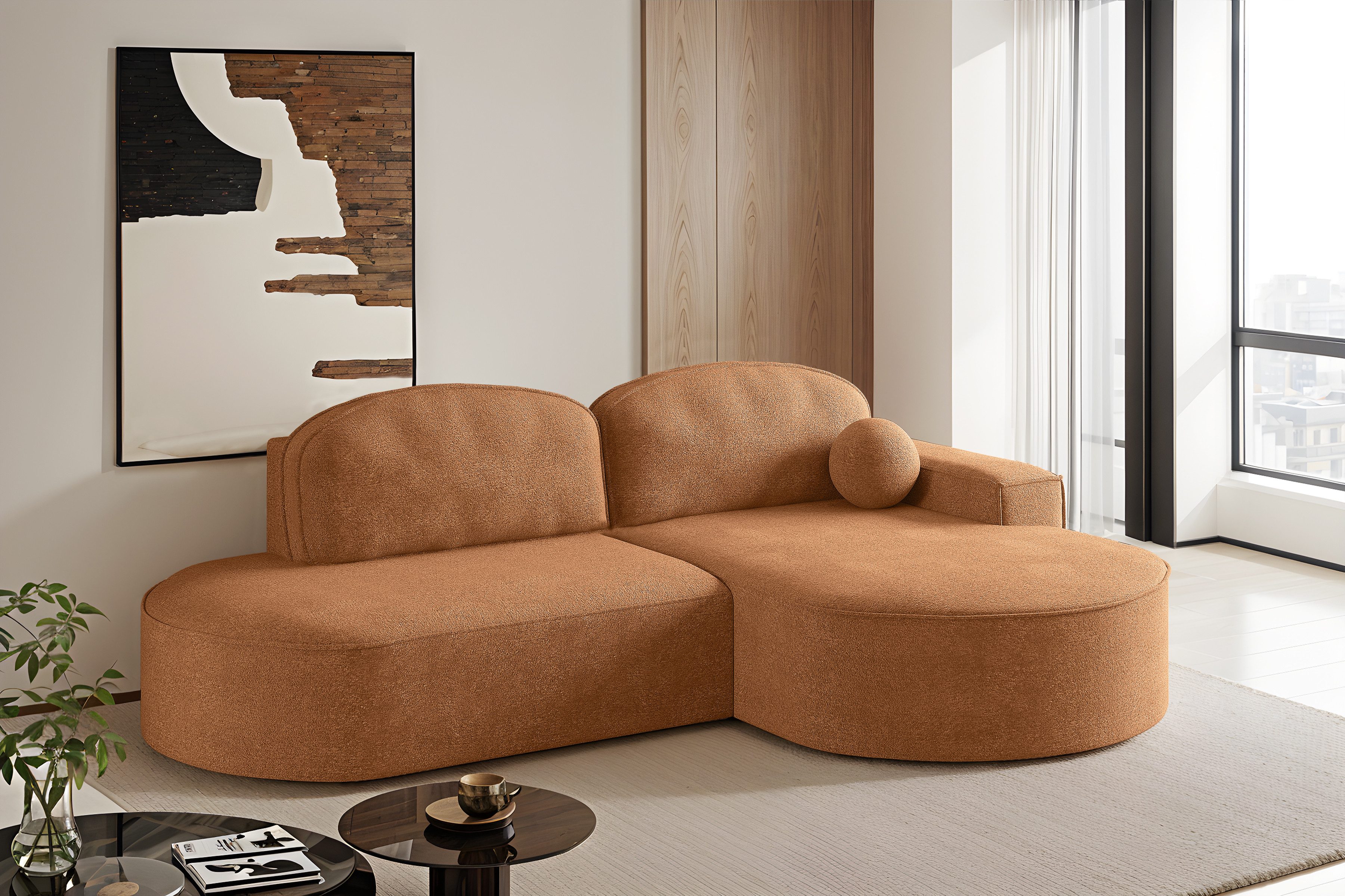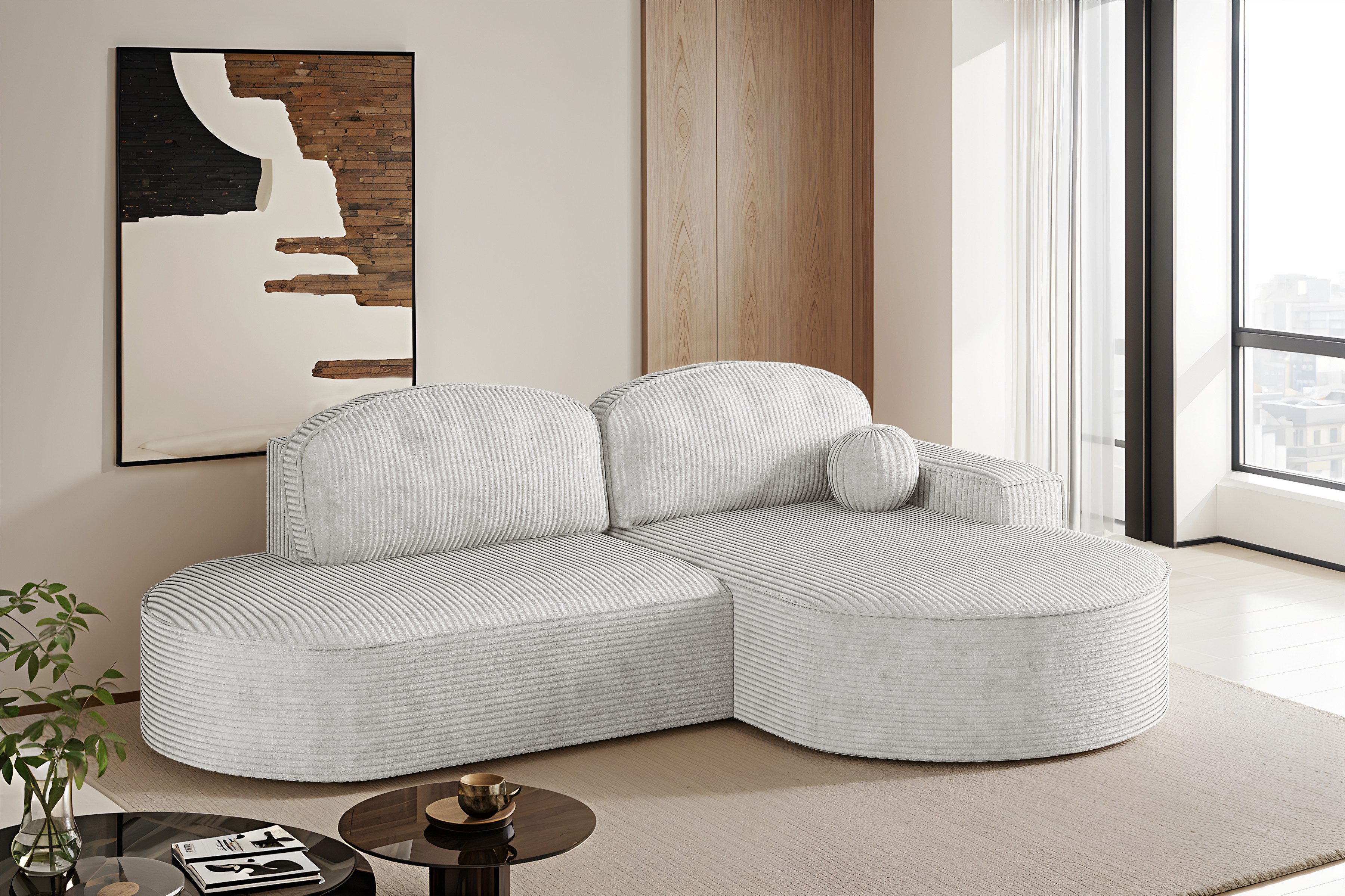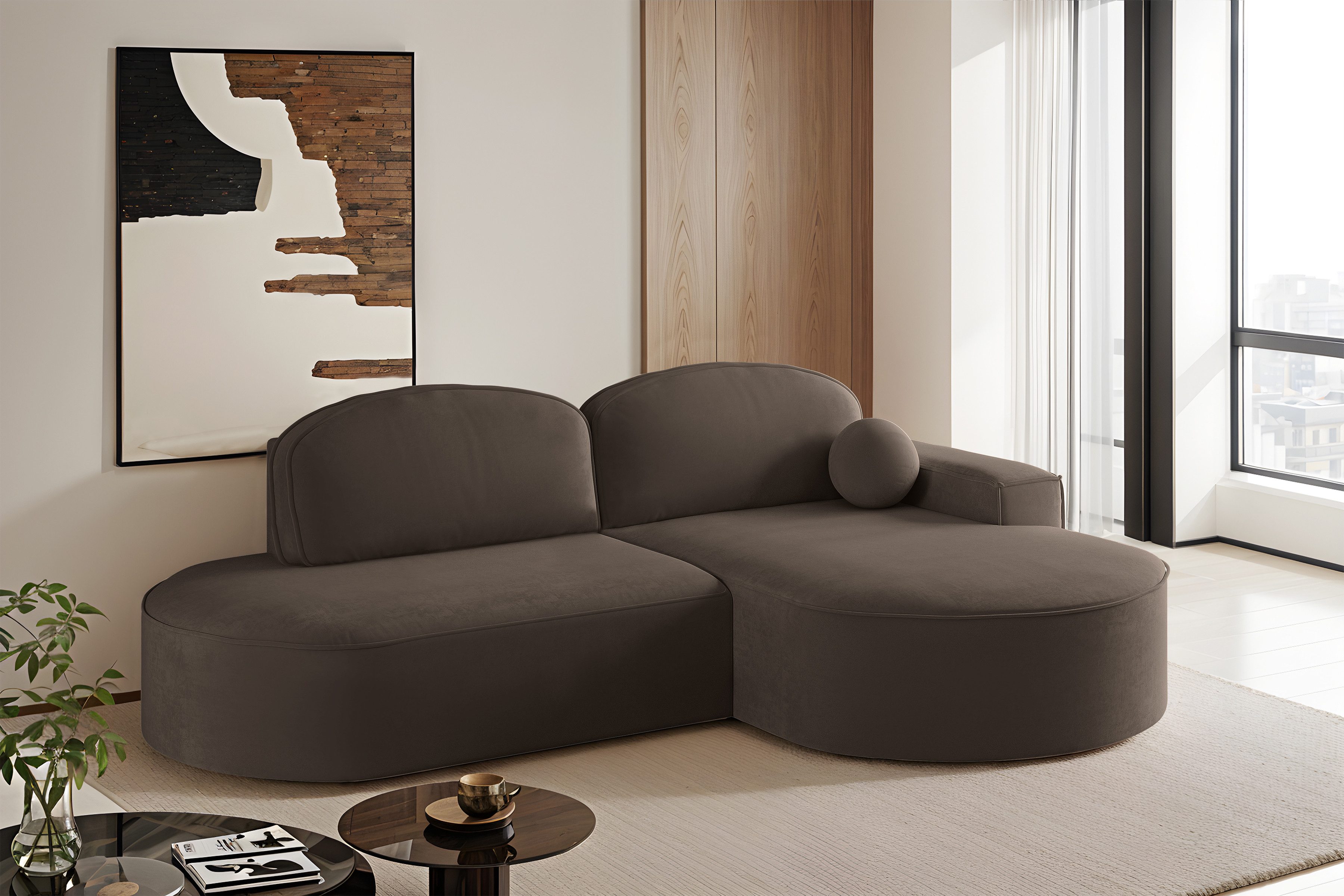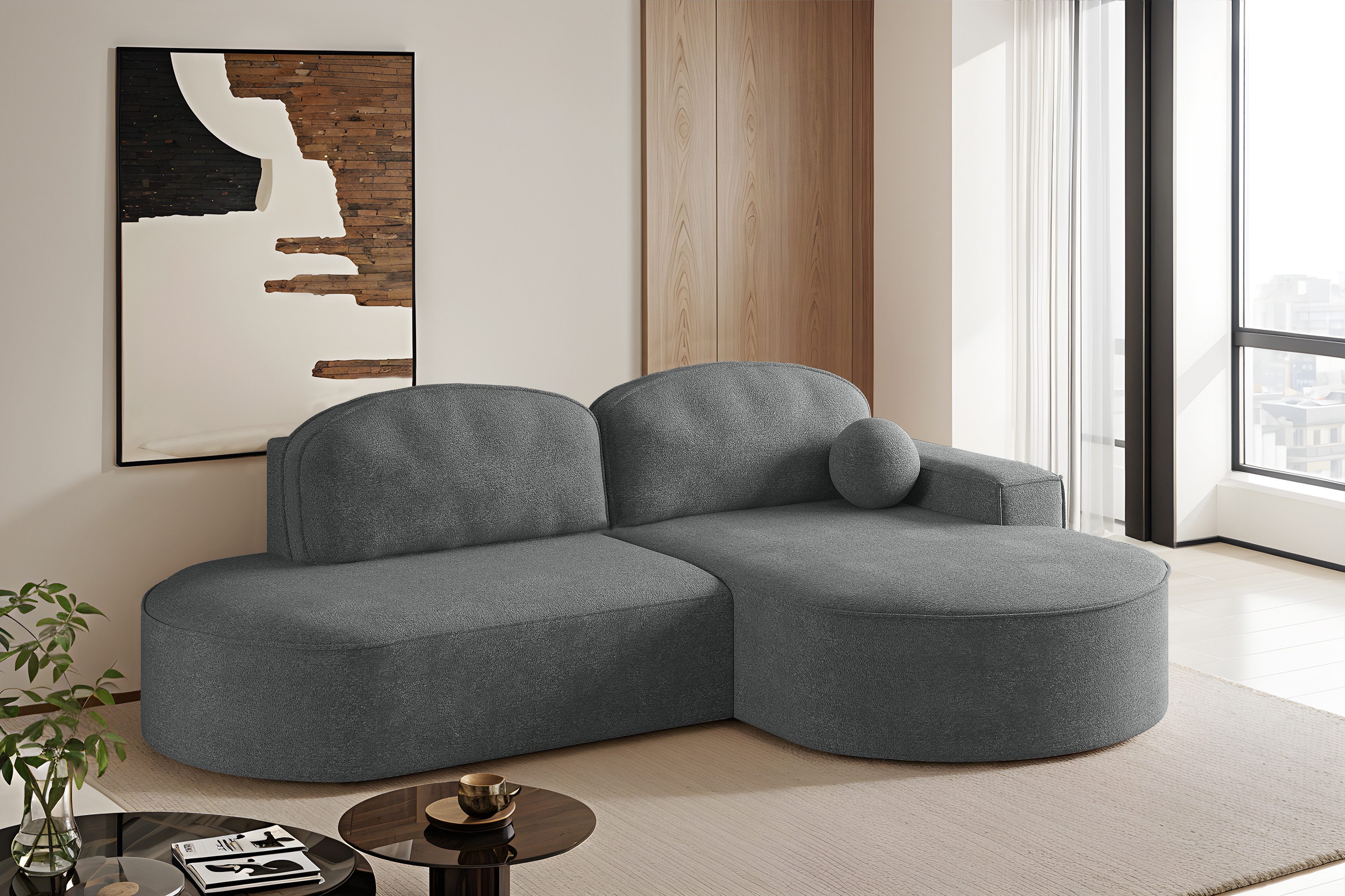 Das Ecksofa Modena Runden vereint modernes Design, Komfort und Zweckmäßigkeit. Dank seiner abgerundeten Formen und sorgfältig ausgewählten Stoffe passt es perfekt in modische Einrichtungen – von minimalistisch über Loft bis hin zu skandinavisch. Ausgestattet mit einer Schlaffunktion und einem Behälter für Bettzeug, wird es sich sowohl im Alltag als auch bei Gästebesuchen als nützlich erweisen. Für den Komfort sorgen der hochelastische HR-Schaum, die B-Wellenfedern und die weichen Kissen aus einer Mischung aus Silikon und Schaumstoff. Die automatische Entfaltungshilfe erleichtert die Handhabung, und dank der freistehenden Konstruktion kann das Ecksofa überall im Wohnzimmer aufgestellt werden.
