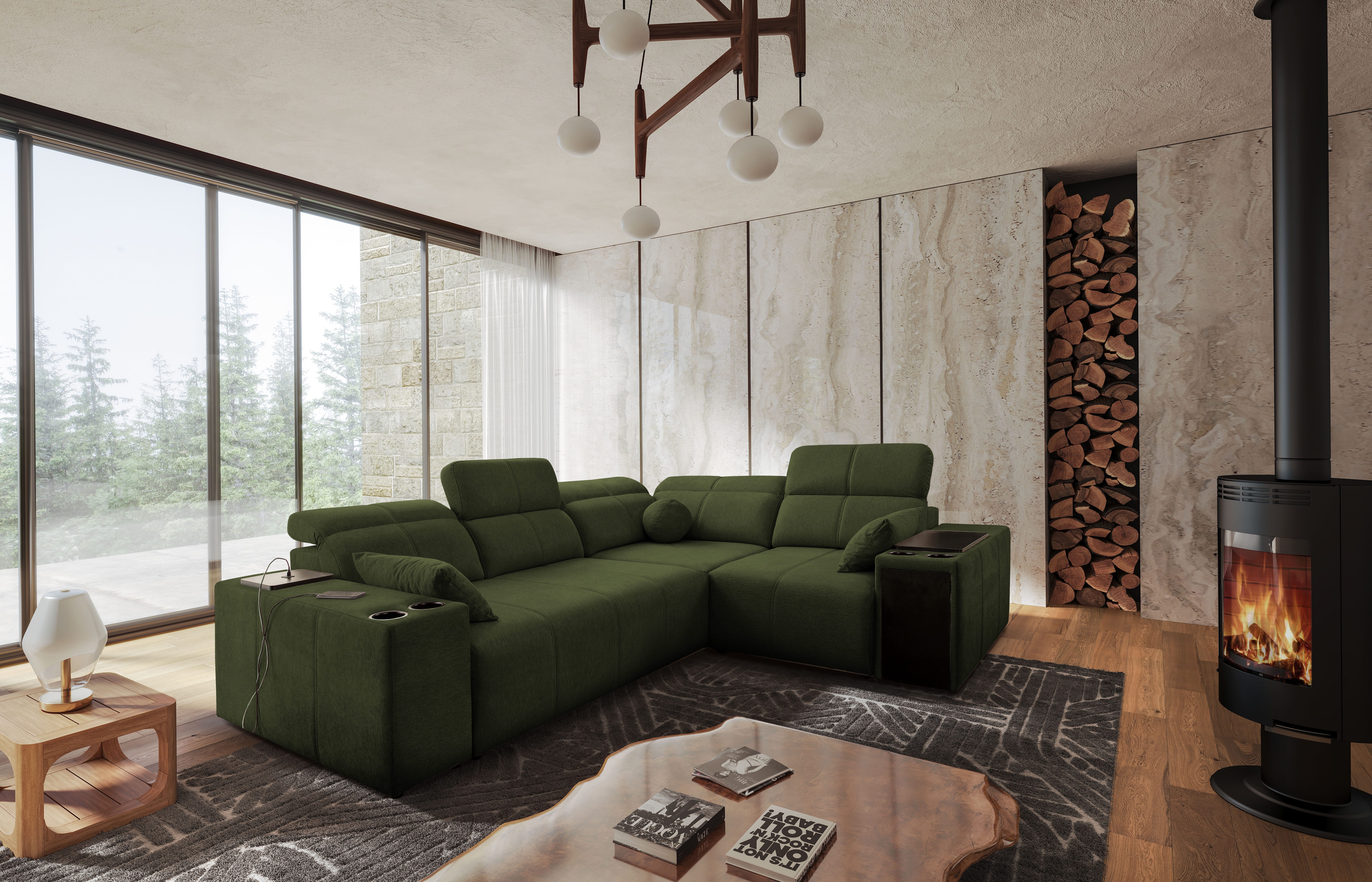Das Ecksofa Mindy II ist klappbar, sodass Sie es sowohl tagsüber als auch nachts erfolgreich nutzen können. Das Auf- und Zusammenklappen der Möbel dauert nur wenige Augenblicke und ist problemlos möglich – und das alles dank einer speziellen Automatikvorrichtung vom Typ Puma, die eingebaut wurde, um die Bedienung so einfach wie möglich zu machen. Das Ecksofa Mindy II erfüllt die Erwartungen selbst der anspruchsvollsten Kunden … und das alles dank der Tatsache, dass sein schlichtes und effektives Design nicht zu übersehen ist. Die schlichte, minimalistische Form ist in einem modernen Stil gehalten und sieht in großen Innenräumen großartig aus. Das Ecksofa in L-Form bietet eine große und bequeme Sitzfläche und durch die verstellbaren Rückenlehnen können Sie die Sitztiefe individuell an Ihre Vorlieben anpassen. Aber das ist noch nicht alles, in einer der Armlehnen erwartet Sie eine ganz andere und außergewöhnliche Überraschung – zwei Stangen und zwei Getränkehalter! Das ist eine tolle Idee, wenn wir beispielsweise zu einer Abendsession gerne ein Glas Wein trinken.