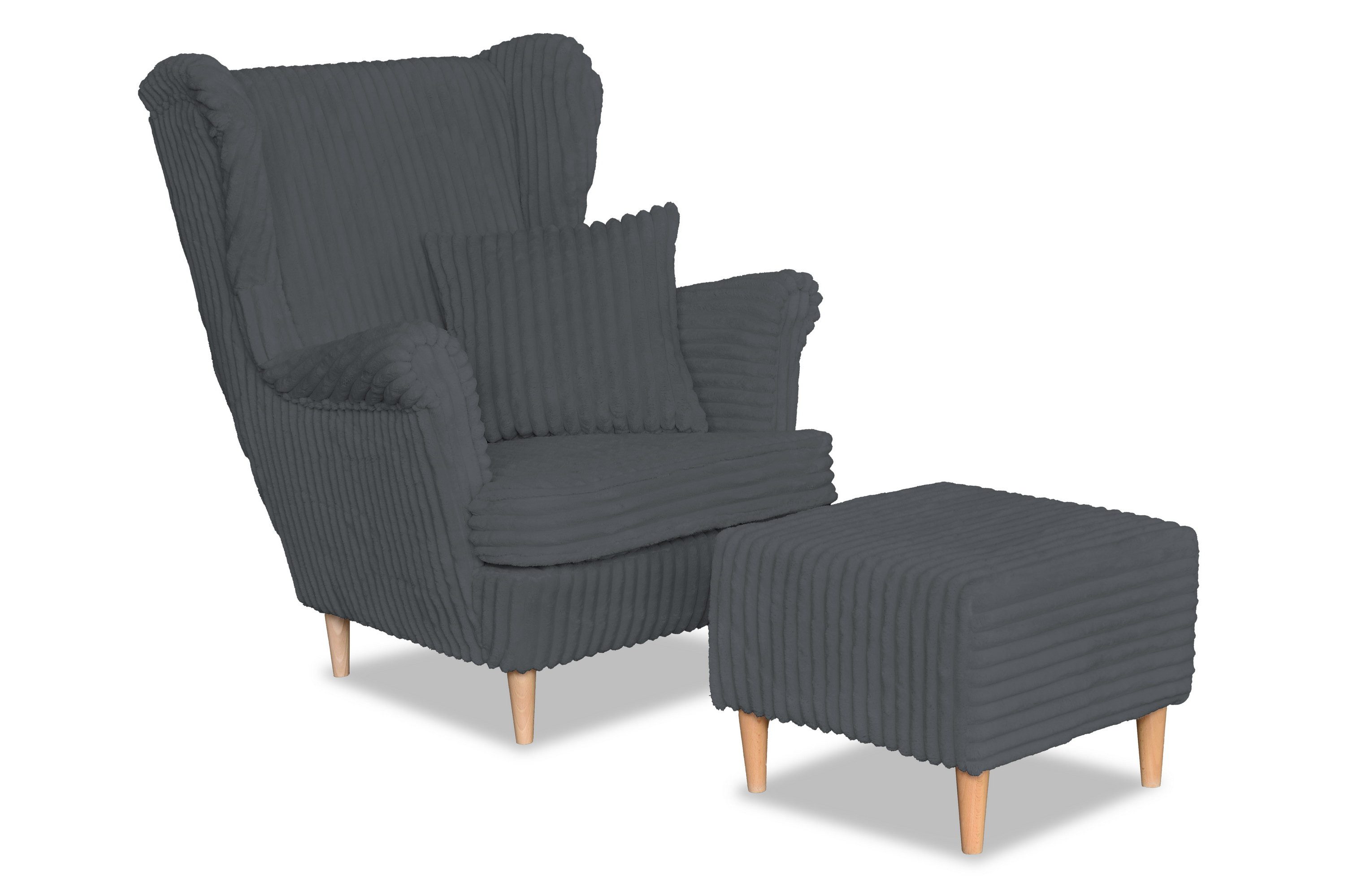Der stilvolle Ohrensessel RENE mit Fußhocker ist eine einzigartige Kombination aus Komfort und Eleganz. Die hohe Rückenlehne mit den charakteristischen „Ohren“ und die entsprechend geformten Armlehnen bieten eine stabile Stütze für Rücken und Arme, während das weiche Sitzkissen für zusätzlichen Komfort sorgt. Die schlanken Holzbeine verleihen dem ganzen Möbelstück Leichtigkeit und passen perfekt in gemütliche und moderne Einrichtungen. Zum Set gehört auch ein Zierkissen, das den ästhetischen Charakter des Möbels unterstreicht und den Ruhekomfort erhöht.