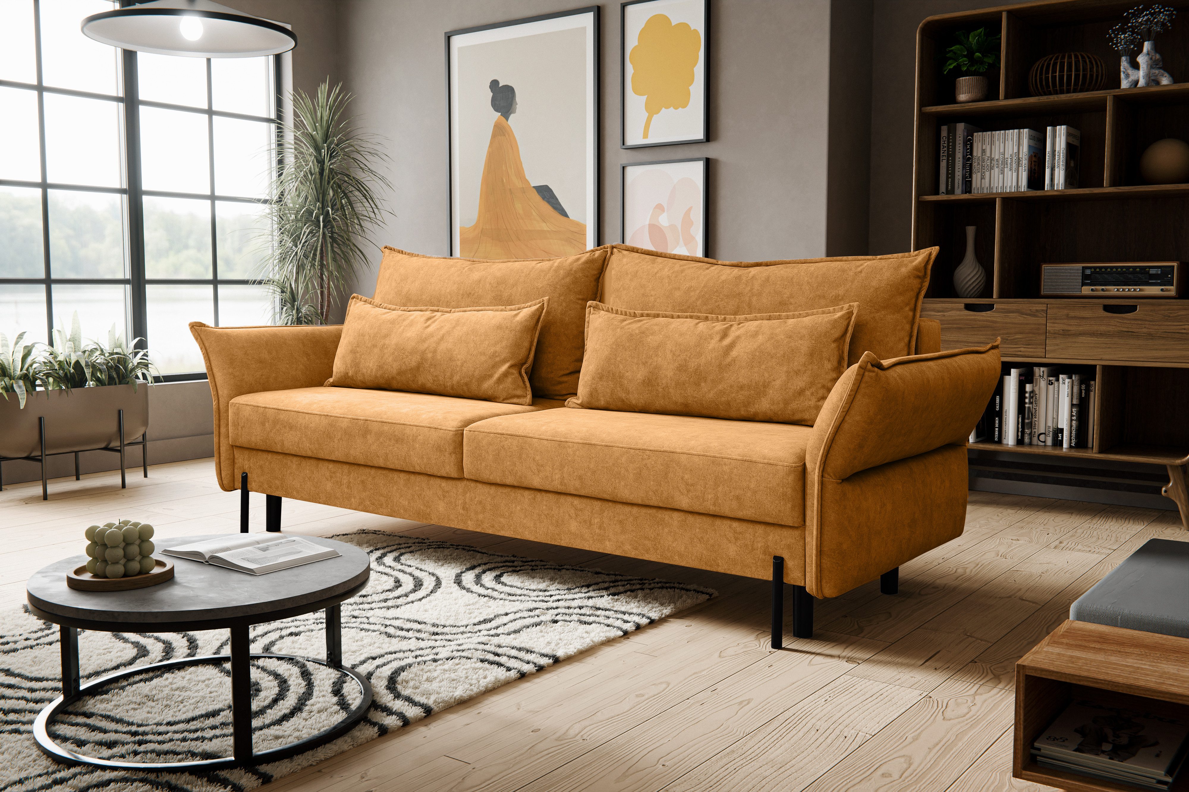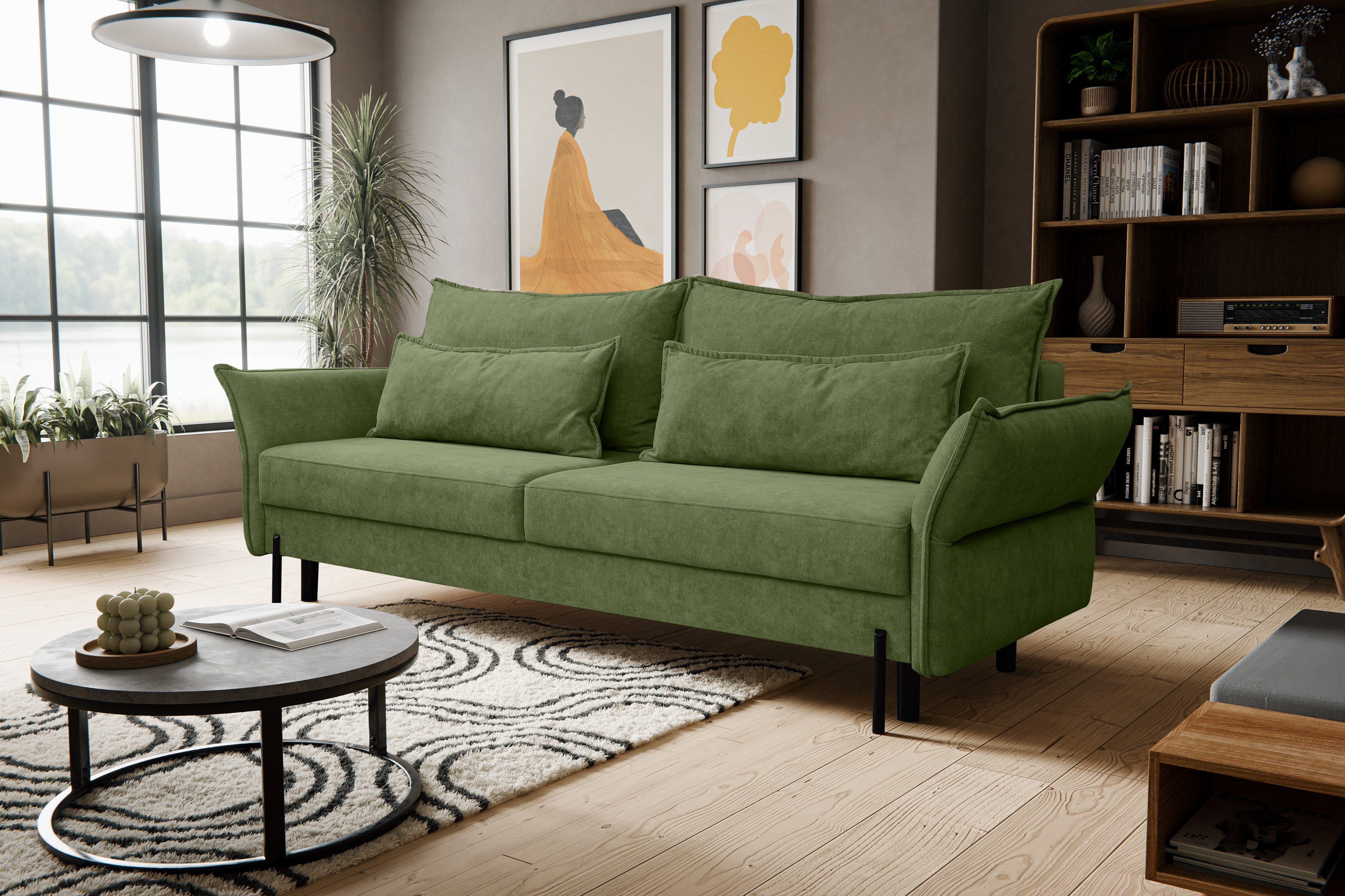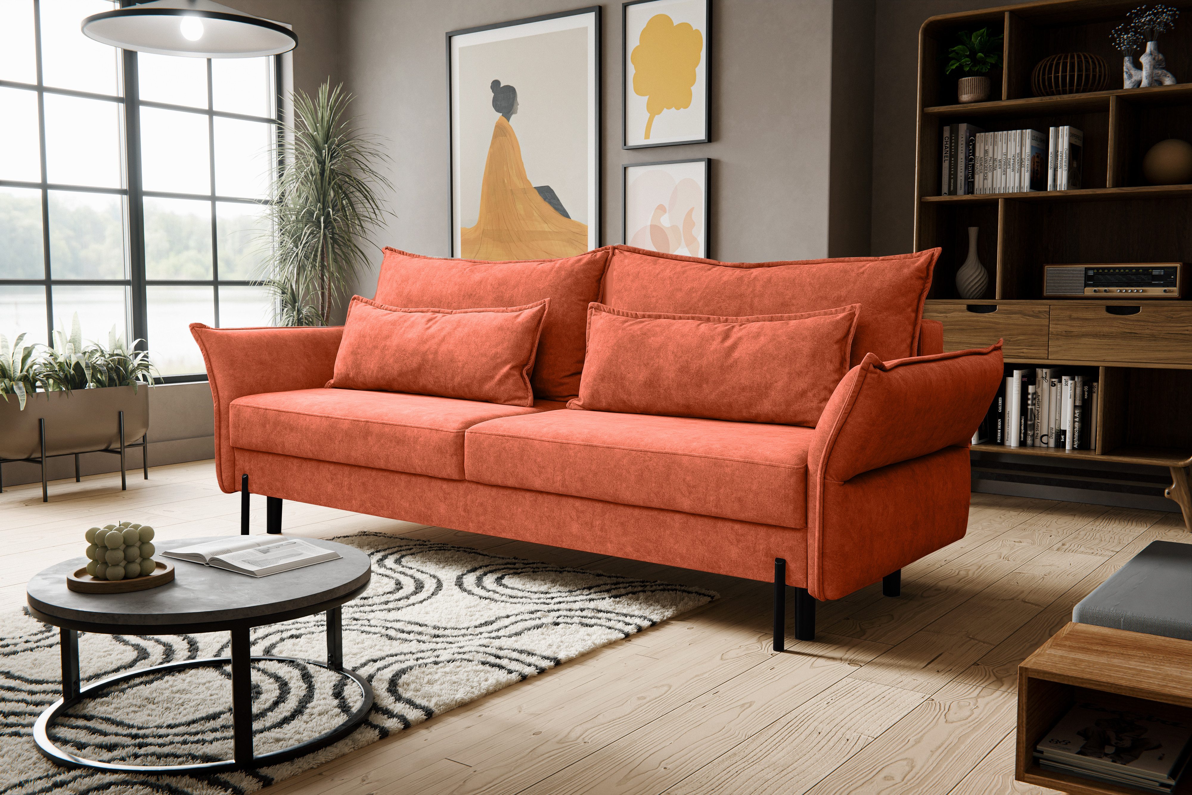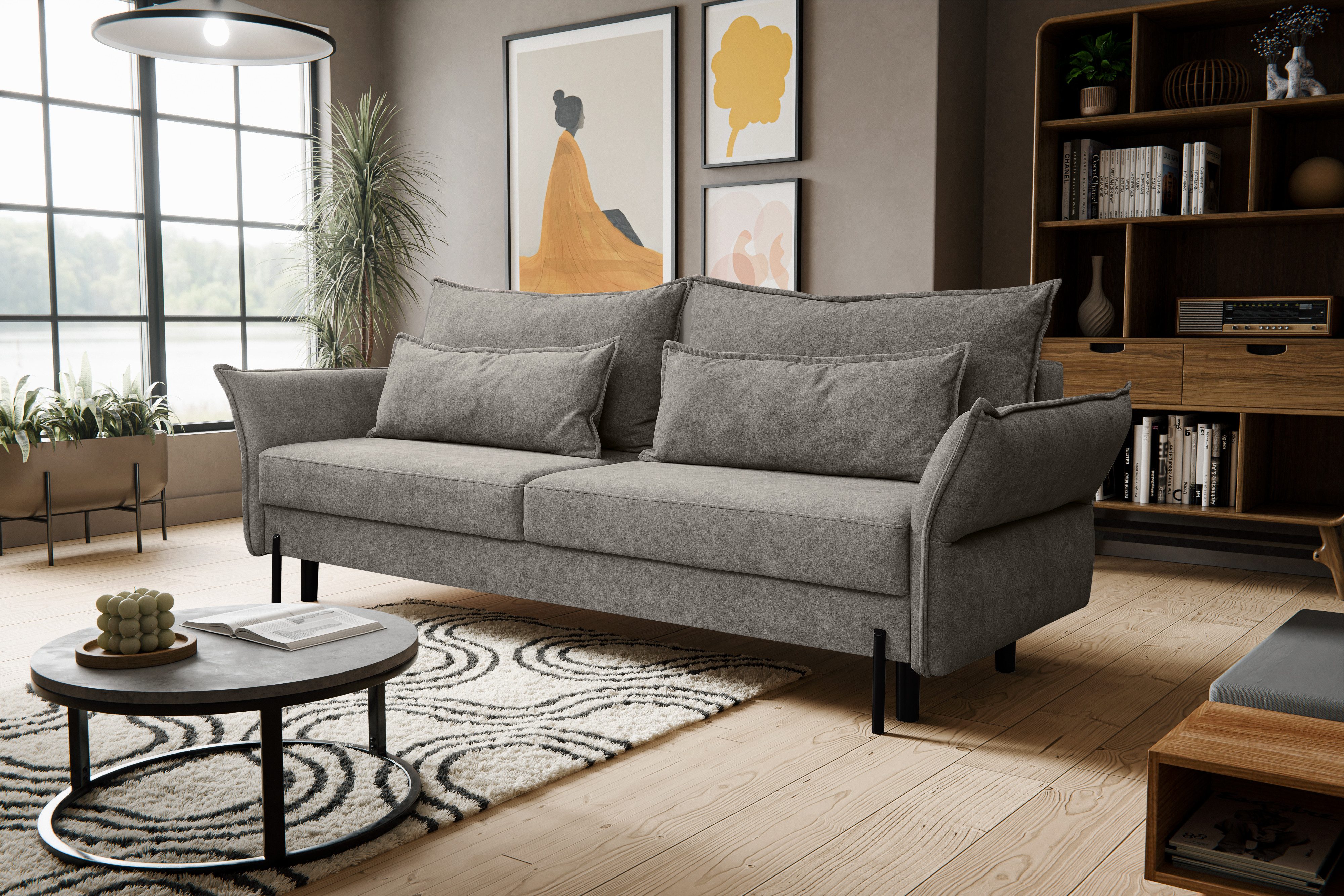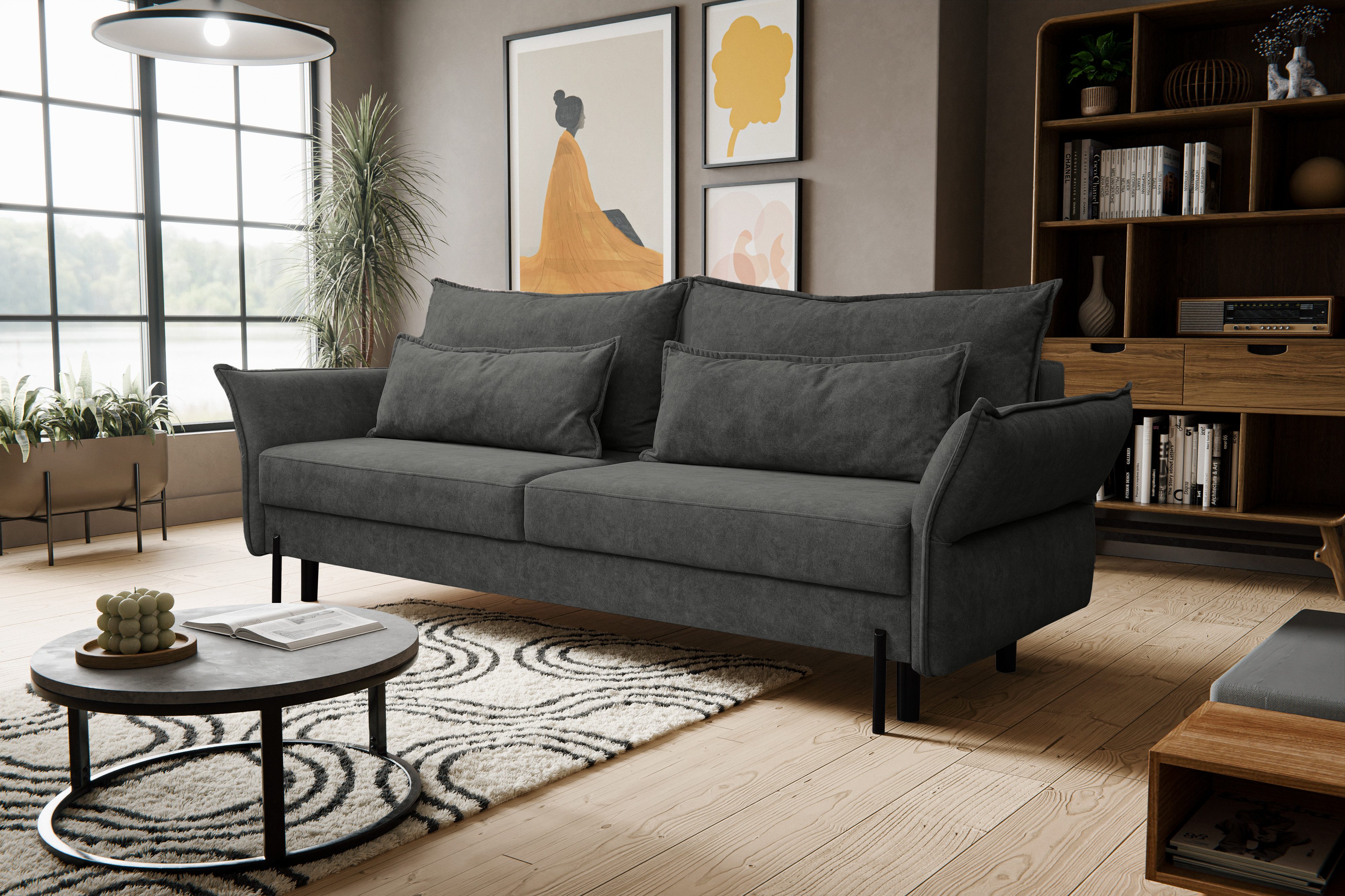 Sofa Volio ist ein echter Blickfang und wird ein breites Publikum ansprechen. Das betreffende Modell basiert auf einem Holzrahmen, der in Kombination mit einer Möbelplatte eine dauerhafte, stabile und feste Struktur bildet. Von außen fällt das Sofa durch seine großen abnehmbaren Rückenkissen auf. Die Sitzfläche des Sofas ist aus hochflexiblem Polsterschaum und gewellten Federn gefertigt. Diese Kombination ist eine Garantie für die Weichheit und die Beständigkeit der Sitzfläche gegen Verformung. Das Sofa Volio ist an allen Seiten gepolstert, auch an der Rückenlehne, was es zu einem freistehenden Möbelstück macht, d. h. zu einem Möbel, das sich leicht von der Wand wegbewegen und in die Mitte eines Raumes stellen lässt. Das betreffende Sofa ist mit einer Schlaffunktion ausgestattet. Dies ist ideal für kleinere Wohnungen, in denen das Wohnzimmer auch als Gästezimmer genutzt wird. Es lässt sich mit wenigen Handgriffen in ein Bett umwandeln, was durch einen DL-Booster zusätzlich erleichtert wird. Unter der Ottomane befindet sich ein Bettzeugbehälter, in dem nicht nur Bettdecken und Kissen, sondern auch andere Dinge Platz finden.