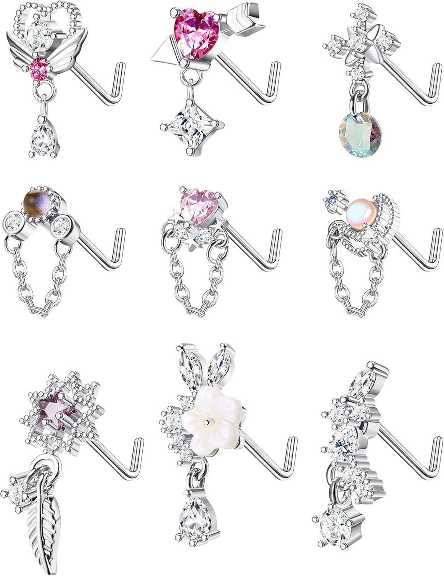 Die Kakonia 9 Stück 20G baumelnden Nasenpiercings sind das ideale Geschenk für Frauen, sei es zum Geburtstag, Valentinstag, Muttertag oder einfach nur, um Ihre Zuneigung auszudrücken. Jedes Set enthält 9 verschiedene baumelnde Nasenstollen, jeder mit seinem eigenen einzigartigen Stil wie Feder, Herz, Flügel, Pfeil, Blumen, Schneeflocken, CZ und mehr. Diese Nasenpiercings sind aus hochwertigem 316L-Edelstahl gefertigt, eingelegt mit glänzenden AAA+CZ, leicht und dennoch robust. Dank des l-förmigen Designs sind sie einfach anzulegen und angenehm zu tragen.