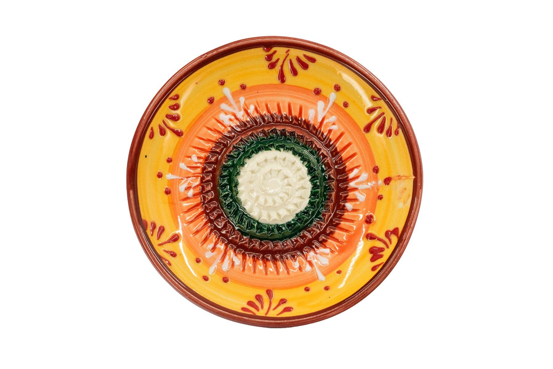 Haushaltshelfer müssen nicht nur praktisch, sondern können auch ein Hingucker für die Küche sein. Die Keramik Reibeteller sind Unikate die in Handarbeit in Spanien hergestellt werden. Ganz einfach gelingt das Reiben von Knoblauch, Ingwer, Gewürze, Schokolade, Tomate, Parmesan, Muskatnuss Zitrone/Orange und vieles mehr. Die Anwendung ist einfach: Reiben Sie auf dem Teller so wie es bei Ihnen am besten funktioniert, mit kreisenden Bewegungen oder einfach von links nach rechts. Sie brauchen kein weiteres Geschirr da direkt in die Schale oder den Teller gerieben wird. Bei Knoblauch & Ingwer sollte die Reibe angefeuchtet werden. Все trockenen Zutaten werden trocken gerieben. Die Teller reiben fast alles und im Vergleich zu Reiben aus Metall besteht kaum Verletzungsgefahr. Auch durch eine starke und regelmäßige Nutzung stumpfen die Zähne nicht ab und bleiben wie am ersten Tag. Die Reibeteller haben einen Durchmesser von 12cm und sind spülmaschinenfest.