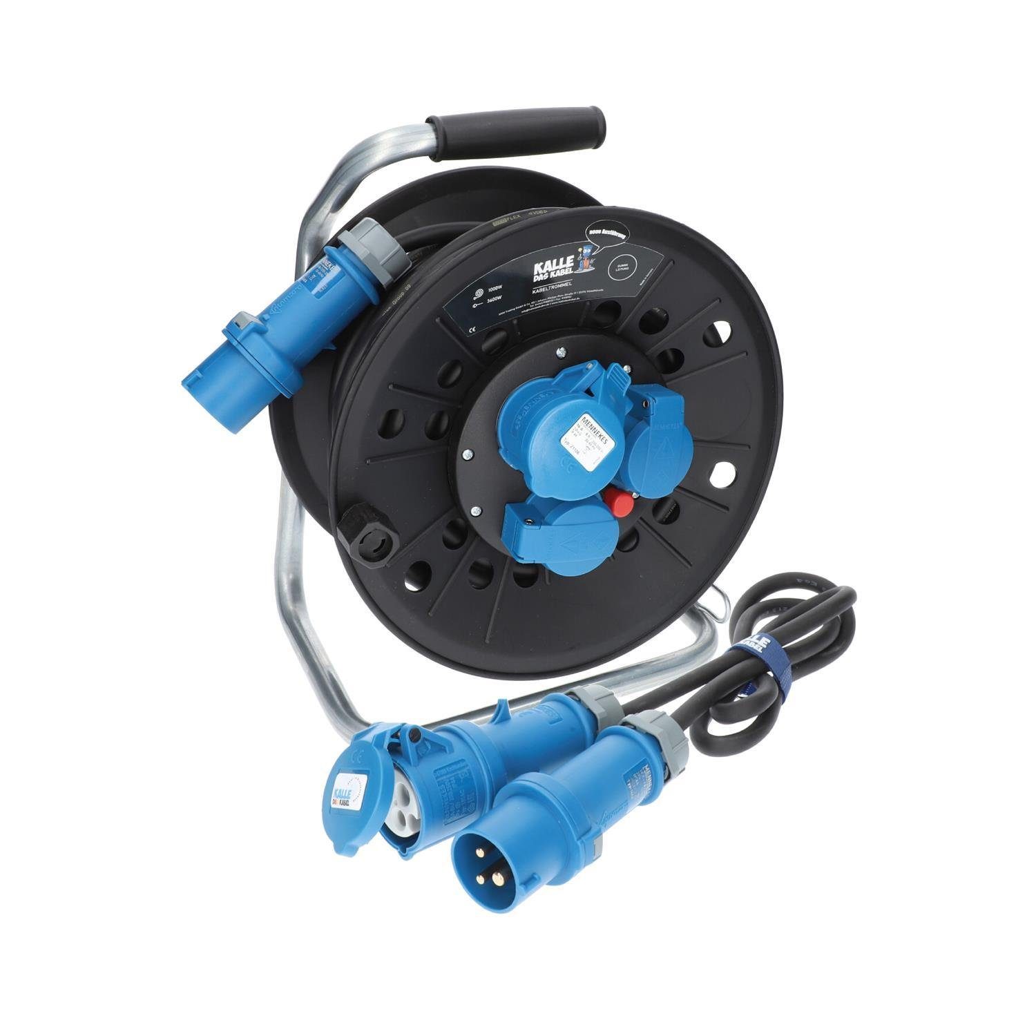 Diese Kalle das Kabel Kabeltrommel ist perfekt für die schnelle und flexible Stromversorgung entwickelt. Einfach abrollen und mit dem CEE Stecker anschließen, schon haben Sie am Einsatzort eine CEE und zwei Schutzkontaktsteckdosen zur Verfügung. Das schwarze Kabel ist sehr robust, ölbeständig und eignet sich zudem für den ständigen Gebrauch im Freien. Durch den optimierten Trommelkörper wird eine gute Wärmeableitung und bessere Trocknung bei nass aufgerolltem Kabel durch die Aussparungen im Trommelkörper gewährleistet. Der drehbare Griff erleichtert das Aufrollen des Kabels, zudem ist mit der praktischen Kabelführung ein leichtes Auf- und Abrollen sichergestellt. Der Thermoschutzschalter ist eine Schutzeinrichtung, die bei Überhitzung der Kabeltrommel den Stromkreis automatisch unterbricht, damit keine Gefahr durch übermäßige Erwärmung entsteht. Bei Auslösung des Thermoschalters alle Stecker aus der Kabeltrommel ziehen und nach Abkühlung der Trommel den Rückstellknopf drücken.