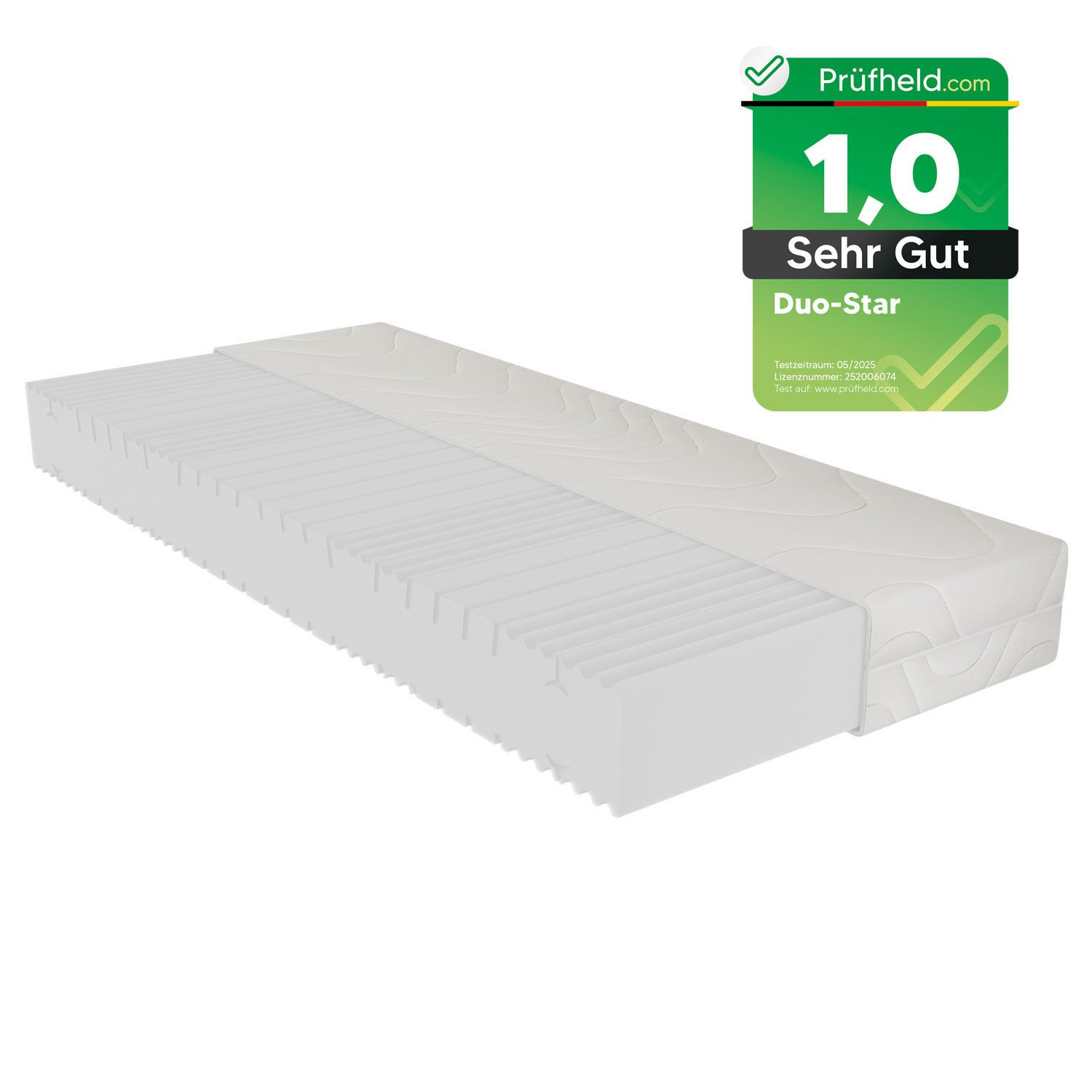 Testsiegel | Sehr Gut (1,0) getestet (Prüfheld, getestet wurde die 90×200 cm in H2/H3, Testzeitraum 05/25, Lizenznummer 252006074) |