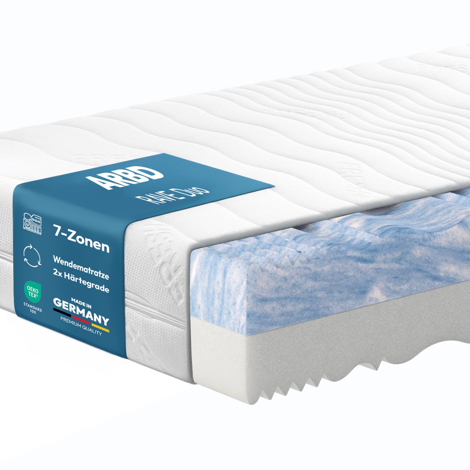 RAVE DUO Kaltschaummatratze – 7‑Zonen – H2/H3 oder H3/H4 – 22 cm – RG40 – Made in Germany Die RAVE DUO Kaltschaummatratze bietet Ihnen individuellen Liegekomfort durch zwei kombinierte Härtegrade: H2/H3 oder H3/H4. Einfach wenden und den für Sie passenden Härtegrad wählen – ideal bei wechselnden Bedürfnissen oder für Paare mit unterschiedlichen Schlafgewohnheiten. Der hochwertige RAVE-Deluxe-Schnitt im 20 cm hohen Kaltschaumkern sorgt für eine punktgenaue Körperanpassung. Die Matratze passt sich optimal an Ihre Körperform an und unterstützt ergonomisch richtiges Liegen – für ein Gefühl wie auf Wolken. Top Features auf einen Blick: Wendematratze mit zwei Härtegraden: H2/H3 oder H3/H4 – individuell anpassbar 7‑Zonen‑Komfort: Ergonomische Einschnitte für Kopf, Schulter, Rücken, Hüfte, Beine und Füße Kaltschaum RG40: Hochwertiger, atmungsaktiver Schaum mit exzellenter Punktelastizität Gesamthöhe: ca. 22 cm (20 cm Kaltschaumkern + 2 cm Bezug) Bezug: Abnehmbar, waschbar bei 40 °C, rundum Reißverschluss, allergikerfreundlich Hergestellt in Deutschland: Qualität, auf die Sie sich verlassen können Für Всеrgiker geeignet: Atmungsaktiv, feuchtigkeitsregulierend, antibakteriell Farbabweichungen möglich: Die Kernfarbe kann produktionsbedingt variieren Warum eine 7‑Zonen‑Kaltschaummatratze? Die 7‑Zonen‑Technologie unterstützt Ihren Körper punktgenau. Jeder Bereich – vom Kopf bis zu den Füßen – wird bedarfsgerecht entlastet oder gestützt. Besonders bei Seitenschläfern sorgt die weiche Schulterzone für ein angenehmes Einsinken, während das Becken gestützt wird, um eine gesunde Wirbelsäulenhaltung zu fördern. So schlafen Sie orthopädisch korrekt und besonders komfortabel. Vorteile der RAVE DUO 7‑Zonen‑Matratze: Gesunder, ergonomischer Schlaf durch perfekte Körperzonenunterstützung Hohe Atmungsaktivität – ideal bei nächtlichem Schwitzen Besonders langlebig dank Raumgewicht 40 kg/m³ Flexibel drehbar – verlängert die Lebensdauer der Matratze Made in Germany – geprüfte Qualität & nachhaltige Produktion Diese Matratze vereint Komfort, Qualität und Anpassungsfähigkeit – für Ihren perfekten Schlaf. Ob H2/H3 oder H3/H4: Mit der RAVE DUO Kaltschaummatratze treffen Sie immer die richtige Wahl.