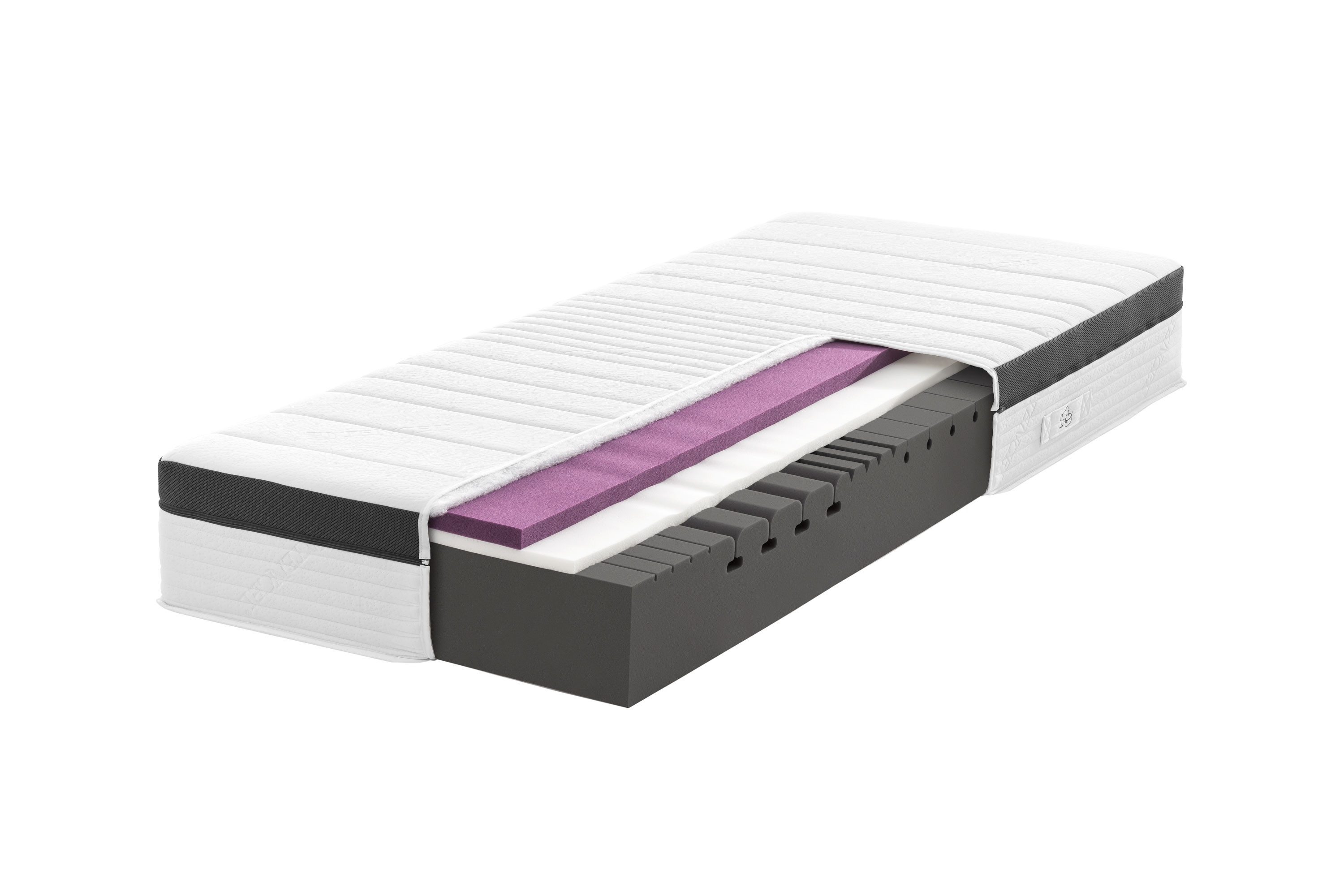 Kernaufbau | Kern: 18 cm Basiskern mit 7-Zonen im Konturschnitt - RG 35; 2 cm dicke viscoelatische Zwischenschicht - RG 50; 3 cm dicke Gelflexschicht - RG 46 Die drei Schichten sind miteinander verbunden und in eine Trikothülle eingehüllt. |