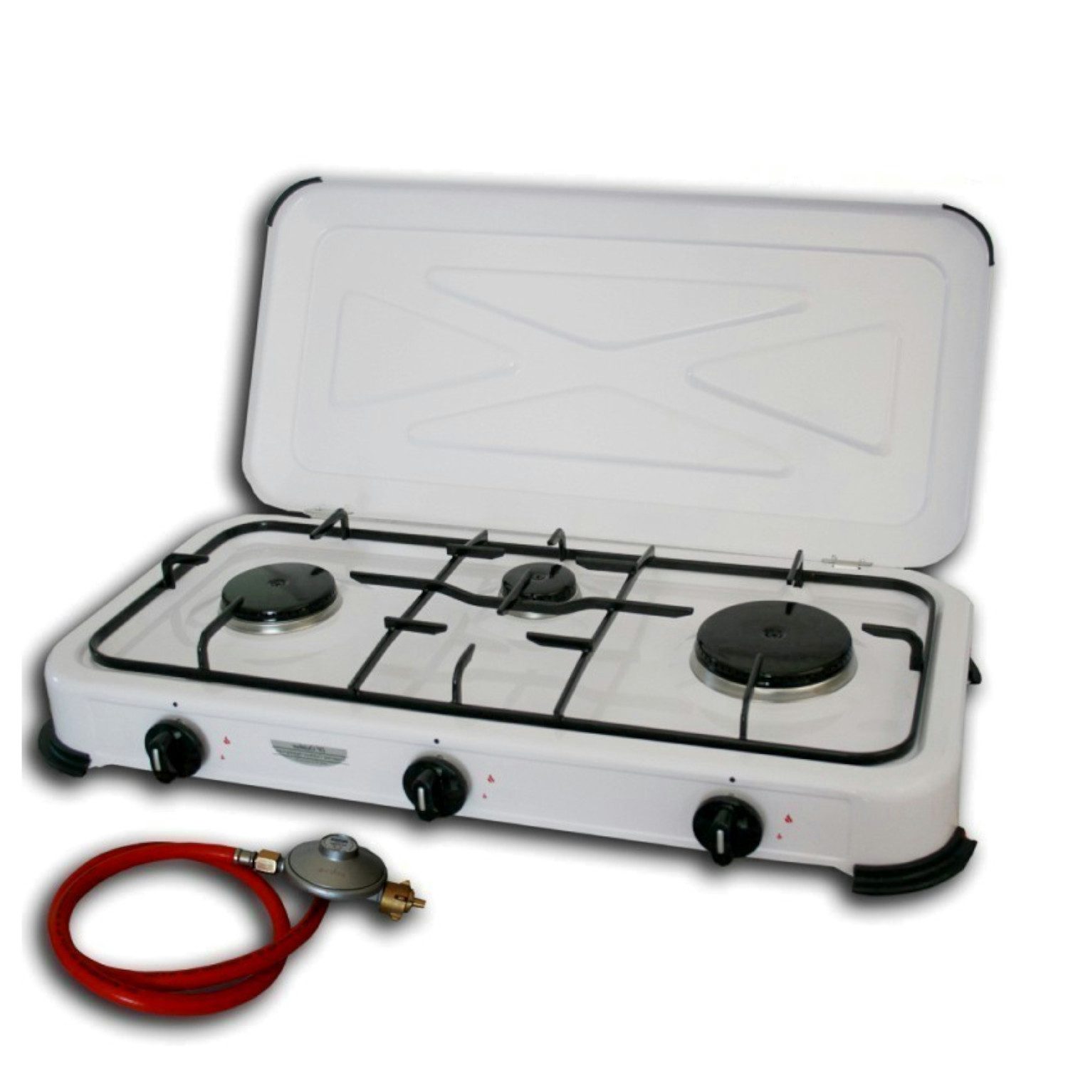 Hochwertiger 3 flammiger Camping-Gaskocher Outdoor - Gute Leistung und einstellbare Brenner - Manuelle Zündung - Emaillierter Ofenrost und Brenner für leichte Reinigung - Schutzabdeckungen für stabilen Stand - Inkl. Anschluss-Schlauch und Druckminderer - Ideal für Camping, Heim, Picknick und Fischen. - Gesamt-Leistung 3,45 kw ( 3-flammig ) 1.4 / 0.85 / 1.2 - Abmessungen ( 3 flammig ): 58 x 33 x 9 cm (BxTxH) - Gewicht: ca. 4 kg - Variable Temperatur-Einstellung - Füße aus Kunst-Stoff - Nenn-Druck: 50 mbar ( Propan, Butan ) - Schlauchanschluss: 1/4" Linksgewinde - Farbe: Weiß - Lieferung inklusive 80cm Anschluss-Schlauch und Druck-Minderer. - Das Gerät ist sofort einsatzbereit.