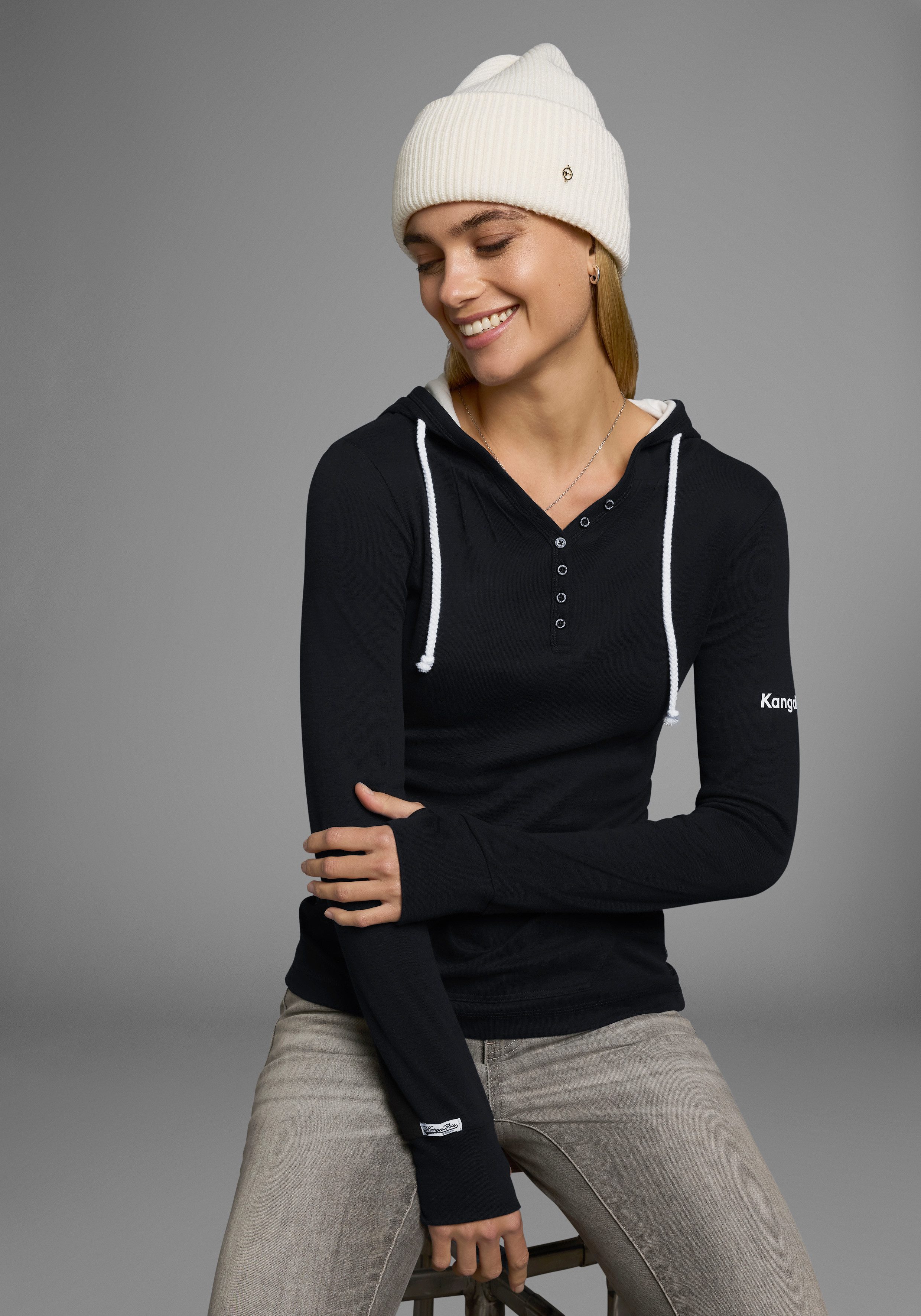 Gesucht und gefunden: Schau dir das Kapuzenshirt von KangaROOS mal genauer an. Durch den Aufdruck wirkt es lässig und peppig. Die langen Ärmel enden in einem Bündchen, das für guten Sitz sorgt und haben Daumenlöcher, die gleichzeitig den guten Sitz bieten und deine Handgelenke warm halten. Dieses Shirt ist hüftbedeckend sowie figurbetont geschnitten, sodass es deine Silhouette schön betont. Mit der Kängurutasche, die am Bauch aufgenäht ist, ist der bequeme Hoodie-Look komplett.