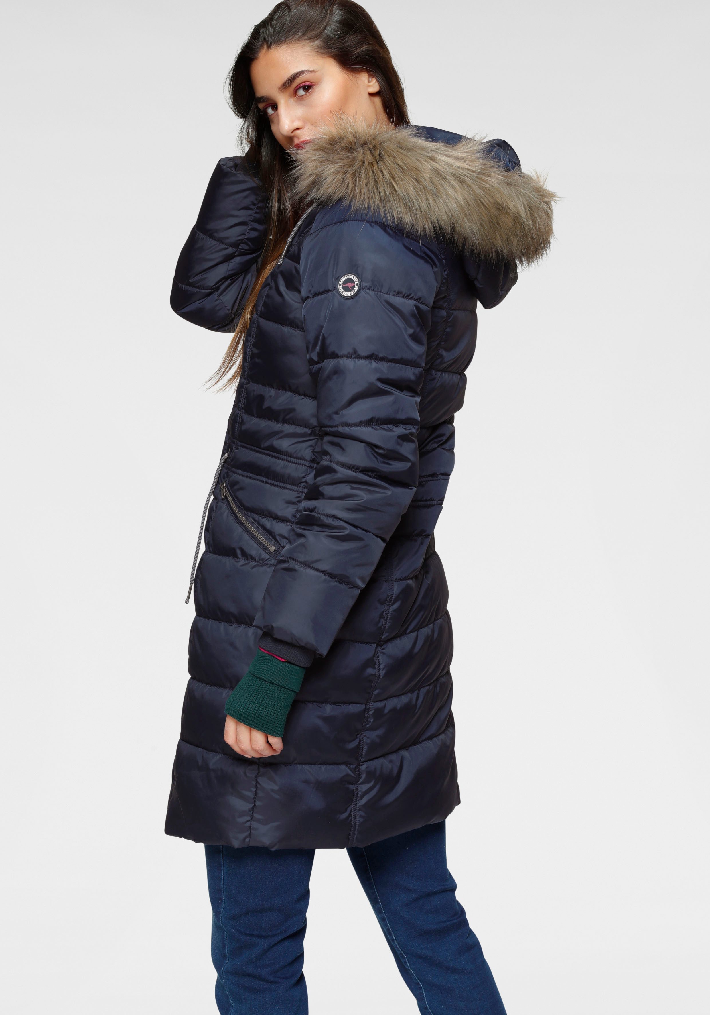 Mit der Steppjacke von KangaROOS liegst du richtig. Der Badge sorgt für dekorative Details. Die langen Ärmel schließen mit einem Rippbündchen ab. Damit lässt sich die Ärmellänge variieren, indem du sie normal oder hoch geschoben trägst. Die Steppjacke bedeckt deinen Po und ist figurbetont geschnitten, so liegt sie leicht an und betont deinen Körper. Die Kapuze hat ein Fellimitat. Mit den Reißverschlusstaschen können wichtige Dinge wie Geldbeutel und Handy nicht mehr herausfallen.