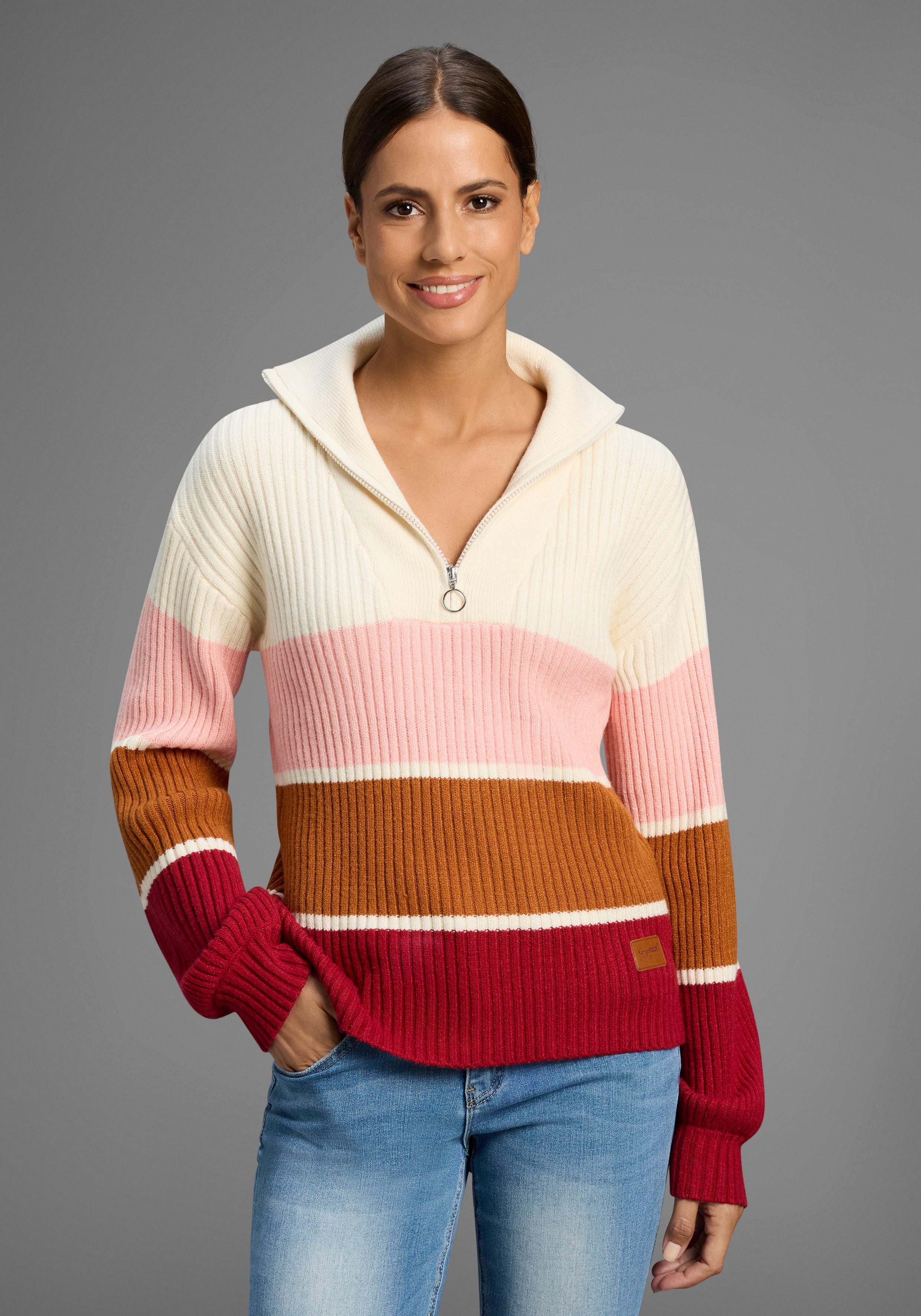 Mit dem Troyer von KangaROOS bist du stilsicher unterwegs und gibst deinem Look den letzten Schliff. Denn der Pullover hat durch die Colourblocking-Optik einen markanten und kontrastreichen Look, der dein Outfit aufwertet. Beim Colourblocking wird mit Farbkombinationen gespielt. Dabei werden entweder kontrastreiche oder ähnliche Farbflächen kombiniert. Die langen Ärmel enden in einem Rippbündchen, das für guten Sitz sorgt. Dieser Pullover ist hüftlang sowie figurumspielend geschnitten, sodass du dich wohlfühlst.