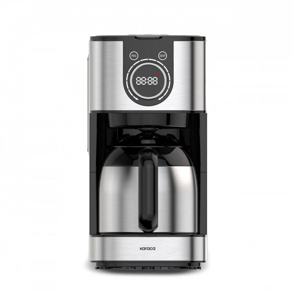 Karaca Series 2303 Stahl Filterkaffeemaschine Mit ihrer großen Kapazität von 1,2 Litern hilft sie Ihnen, köstlichen Kaffee für sich selbst, Ihre Familie und Gäste zuzubereiten, während die Aromafunktion es Ihnen ermöglicht, die Stärke Ihres Kaffees nach Ihrem Geschmack einzustellen. Dank des Warmhaltemodus bleibt Ihr Kaffee 30 Minuten lang warm und schaltet sich automatisch ab, wenn die Zeit abgelaufen ist. Mit der Timer-Funktion ist Ihr Kaffee genau dann fertig, wenn Sie es möchten. Das digitale Display der 2303 Stahl Filterkaffeemaschine hilft Ihnen, die Warmhalte-Einstellung, Aromastärke, den Timer und die verbleibende Brühzeit zu steuern. Mit der Wasserstandsanzeige können Sie leicht die Wassermenge im Inneren sehen. Das Gehäuse aus Edelstahl und der Thermosbehälter bieten eine langlebige und stilvolle Nutzung. Aroma-Funktion (Kaffeestärke): Um die Aroma-Funktion für einen stärkeren Kaffee zu aktivieren, halten Sie vor dem Brühvorgang die PROG-Taste 3 Sekunden lang gedrückt. Auf dem Display sollte das Konzentrationssymbol "☕☕" erscheinen. Um die Aroma-Funktion zu deaktivieren, halten Sie die PROG-Taste erneut 3 Sekunden lang gedrückt, bevor Sie den Brühvorgang starten. Filterkaffee Zubereitung Mit nur einem Knopfdruck ist Ihr Filterkaffee in 5 Minuten fertig und bleibt 30 Minuten lang frisch. Es brüht Ihren Filterkaffee bei der idealen Brühtemperatur von 90 Grad für den perfekten Geschmack. Technische Eigenschaften Farbe: Inox Maße: Длина: 22 cm / Breite: 17 cm / Höhe: 33 cm / Gewicht: 2,35 kg Длина: 8,6 Zoll / Breite: 6,6 Zoll / Höhe: 13 Zoll Spannung: 220-240V Frequenz: 50-60Hz Leistung: 800 Watt Kapazität: 1,2L