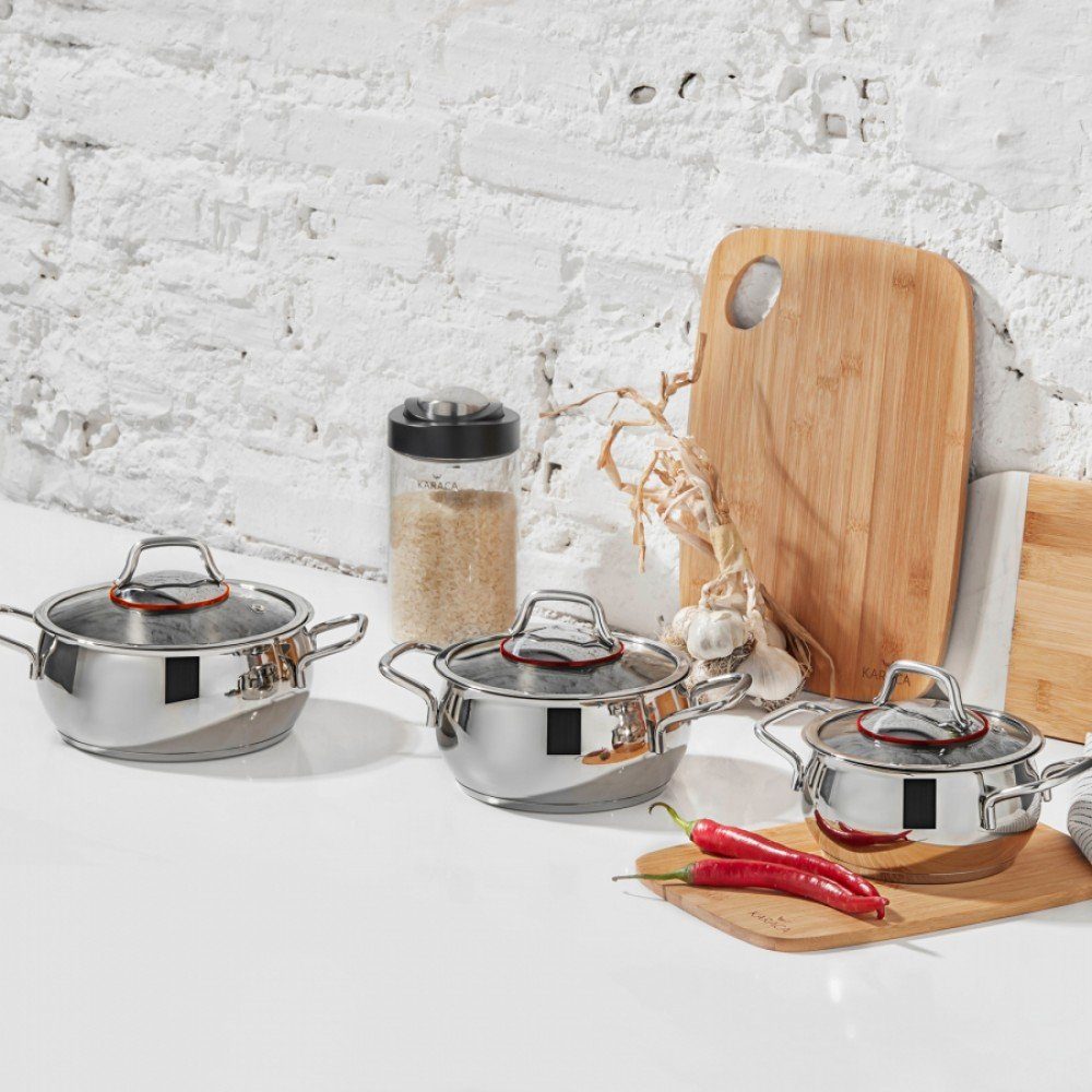 Das Karaca Emirgan Steel Midi Set hilft Ihnen dank des fortschrittlichen Kapselbodens, der für eine gleichmäßige Wärmeleitung sorgt, Ihren Speisen einen fantastischen Geschmack zu verleihen, indem er sie so kocht, dass die Wärme alle Zutaten auf möglichst gleichmäßige und ausgewogene Weise erreicht. Die Oberfläche aus rostfreiem Stahl hält die Hitze länger und ist leicht zu reinigen. Die Glasdeckel sorgen dafür, dass Sie Ihre Speisen während des Kochens gut beobachten können, und helfen Ihnen, die Menge der zu kochenden Speisen dank der drei verschiedenen Topfgrößen leicht auszuwählen oder anzupassen. Die Glasdeckel sorgen dafür, dass Sie Ihre Speisen während des Kochens gut beobachten können, und helfen Ihnen dank der drei verschiedenen Topfgrößen, die Menge der zu kochenden Speisen einfach auszuwählen oder anzupassen. Die Stahltöpfe sind aufgrund ihrer Zusammensetzung aus rostfreiem Stahl rost- und abriebfest. Der spezielle Energiekapselboden sorgt für maximale Zeit- und Energieersparnis und verdoppelt so die Zeit, die Sie in Ihrer Küche verbringen können. Eine der wichtigsten Eigenschaften der Karaca Stahltöpfe ist, dass sie keine krebserregenden Stoffe enthalten und somit einen gesunden Gebrauch gewährleisten, bei dem keine unangenehmen Gerüche oder Bakterien zurückbleiben. İndüksiyon ocaklarda kullanıma uygundur. Geeignet für die Verwendung mit Induktionskochfeldern. 2 Jahre Garantie. Spülmaschinenfest, aber wir empfehlen Handwäsche für einen längeren Gebrauch.