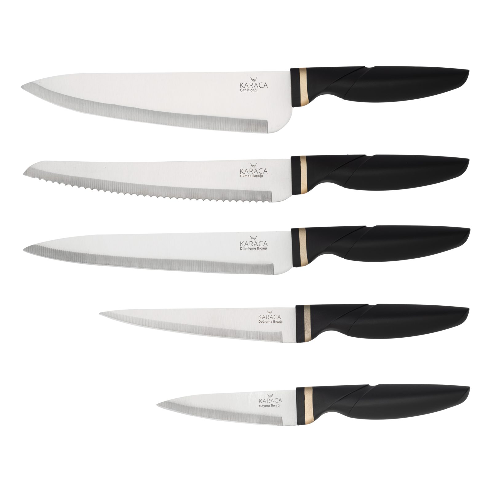 Um köstliche Mahlzeiten zu kochen, können Meisterköche nicht ohne scharfe, ergonomische und funktionelle Messer auskommen. Das Karaca Proofcut 6 Messerset umfasst Schäl-, Schneide-, Tranchier-, Brot- und Chefkochmesser, wobei jedes der fünf Modelle für sich schön ist. Dieses Messerset, das sich durch seine einfache und praktische Zusammenstellung auszeichnet, wird dank seines ergonomischen Griffs und seiner komfortablen Handhabung mit Sicherheit zu einem Ihrer Lieblingsstücke in der Küche. Das Set wird mit einem speziellen Ständer geliefert, der es Ihnen ermöglicht, Ihre Messer einfach aufzubewahren und die Lebensdauer des Produkts zu verlängern. Auf diese Weise spart es Platz und Sie haben mehr Bewegungsfreiheit in der Küche. Die unvergleichliche Schönheit und Ästhetik, die jahrelang anhält, machen dieses Set zu einem großartigen Geschenk für neue Haushalte und Familien, denn das schlichte, aber elegante Design ermöglicht eine vielseitige Verwendung und bietet für jeden Geschmack das Richtige. Karaca ist seit 1973 der größte türkische Hersteller für hochwertiges Geschirr, Küchengeräte, Heimtextilien und Wohnaccessoires. Sie können sich entspannt zurücklehnen und höchste Qualität und hochwertige Produkte von uns erwarten.