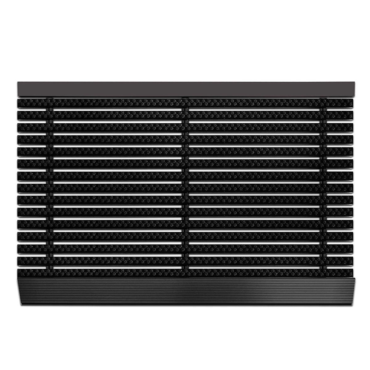 Die Bürstenreihen sind in einem edel anmutenden schwarzen Rahmen aus robustem PVC angeordnet. Dank des hohen Gewichts und Gumminoppen an der Unterseite bleibt die Türmatte stets an ihrem Platz liegen und verrutscht auch bei häufiger Nutzung nicht. Das hochwertige Material trotzt nicht nur starker mechanischer Beanspruchung, sondern auch dem Wetter. So kann die Fußmatte innen genauso wie außen genutzt werden, im privaten ebenso wie im gewerblichen Bereich.