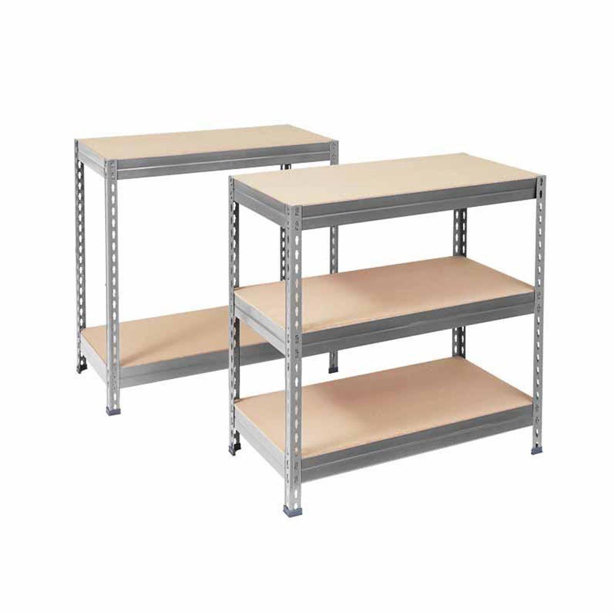 Schwerlastregal mit bis zu 300 kg Tragkraft je Boden und 1500 kg Gesamttraglast. Das Metallregal wird einfach zusammengesteckt und bietet dennoch ein Höchstmaß an Stabilität. Aufgebaut werden kann das Steckregal entweder in voller Höhe mit 5 übereinander angeordneten Böden. Alternativ können auch zwei kleine Regale, eines mit 3, das andere mit 2 Regalböden, zusammengesteckt werden.
