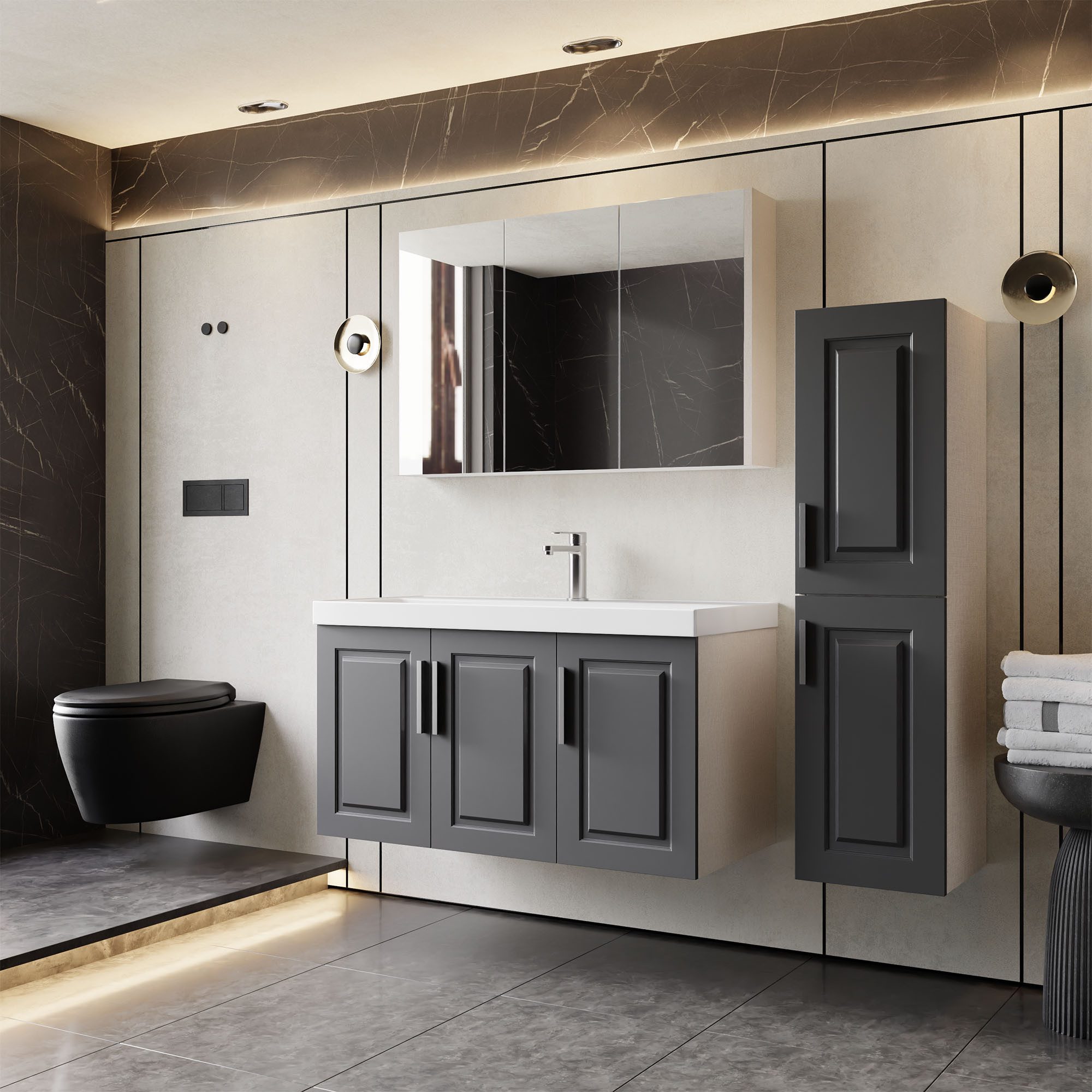 Es handelt sich bei diesem Modell um ein 3-teiliges Badmöbel-Set bestehend aus Waschbeckenunterschrank, Waschbecken und Spiegelschrank. Beide Versionen des Badezimmermöbel Sets können mit einem Hochschrank vervollständigt werden. Hierfür ist ein Hochschrank Anthrazit oder ein Hochschrank Weiß erhältlich.