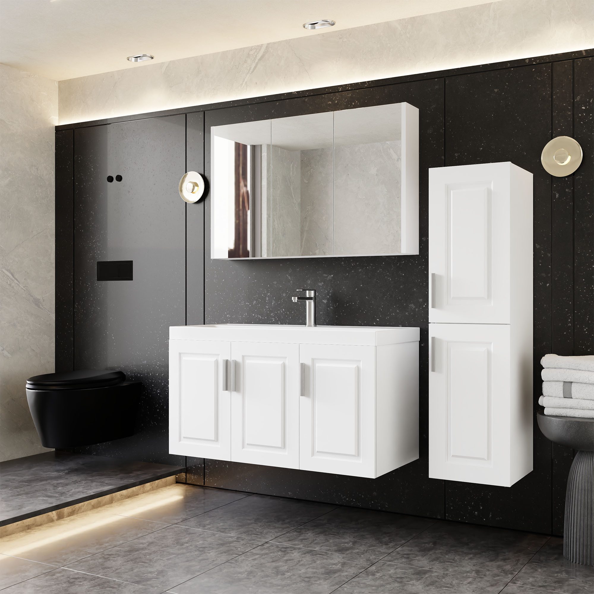 Das Waschbecken ist aus hochwertiger Keramik gefertigt mit passgenauer Form zur Perfektionierung des Badmöbel Set mit Waschbecken. Die „Arin“ Badezimmer Moebel Sets sind nun auch als Waschtisch mit Unterschrank 100 cm erhältlich. So kann bei diesem Badmöbel-Set aus Größen gewählt werden, sodass sowohl für kleine Toiletten oder Gäste-WCs als auch für große Bäder geeignete Badmöbel mit Waschbecken gefunden werden.