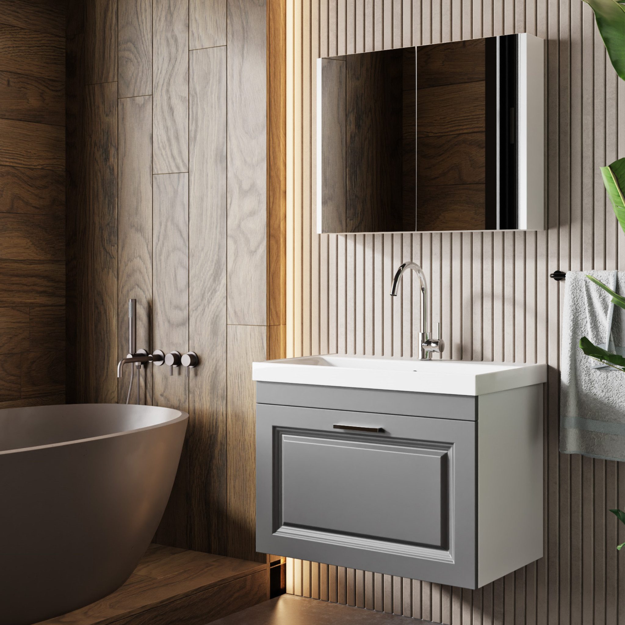 Set beinhaltet | Der Lieferumfang umfasst einen Unterschrank, einen Spiegelschrank und ein Waschbecken. Hinzu kommen Montageanleitung, Beschläge, Fügeelemente, Schutzfolien. |