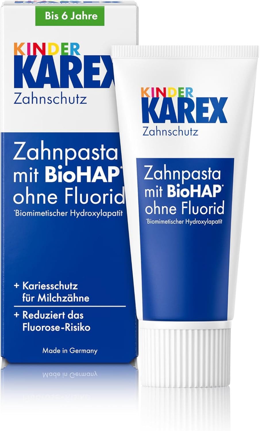 Es ist nie zu früh für die richtige Zahnpflege. Das innovative KAREX-Konzept mit BioHAP, dem Karies-Schutz durch den zahnverwandten („biomimetischen“) Wirkstoff Hydroxylapatit, wurde hier auf die Bedürfnisse von Kindern zugeschnitten. Die Zahncreme ist bereits ab dem ersten Zahn geeignet – auch für Kinder, die beim Zähneputzen noch nicht richtig ausspucken können. Das besonders milde Aroma wurde von Kindern für Kinder ausgewählt. KAREX bietet Schutz und Reparatur für den Zahnschmelz bereits ab dem ersten Zahn. Der KAREX-Wirkstoff Hydroxylapatit ist dem Hauptbestandteil des natürlichen Zahnschmelzes nachgebildet. Durch die tägliche Anwendung der Zahncreme wird die Regeneration angegriffener Stellen im Zahnschmelz unterstützt und eine Schutzschicht ausgebildet. Zusätzlich wirkt KAREX mit Zink und Xylit antimikrobiell. Bakterien und somit Zahnbelag wird so effektiv vorgebeugt. Aufgrund des speichelneutralen pH-Werts ist KAREX besonders schonend zu den Zähnen.