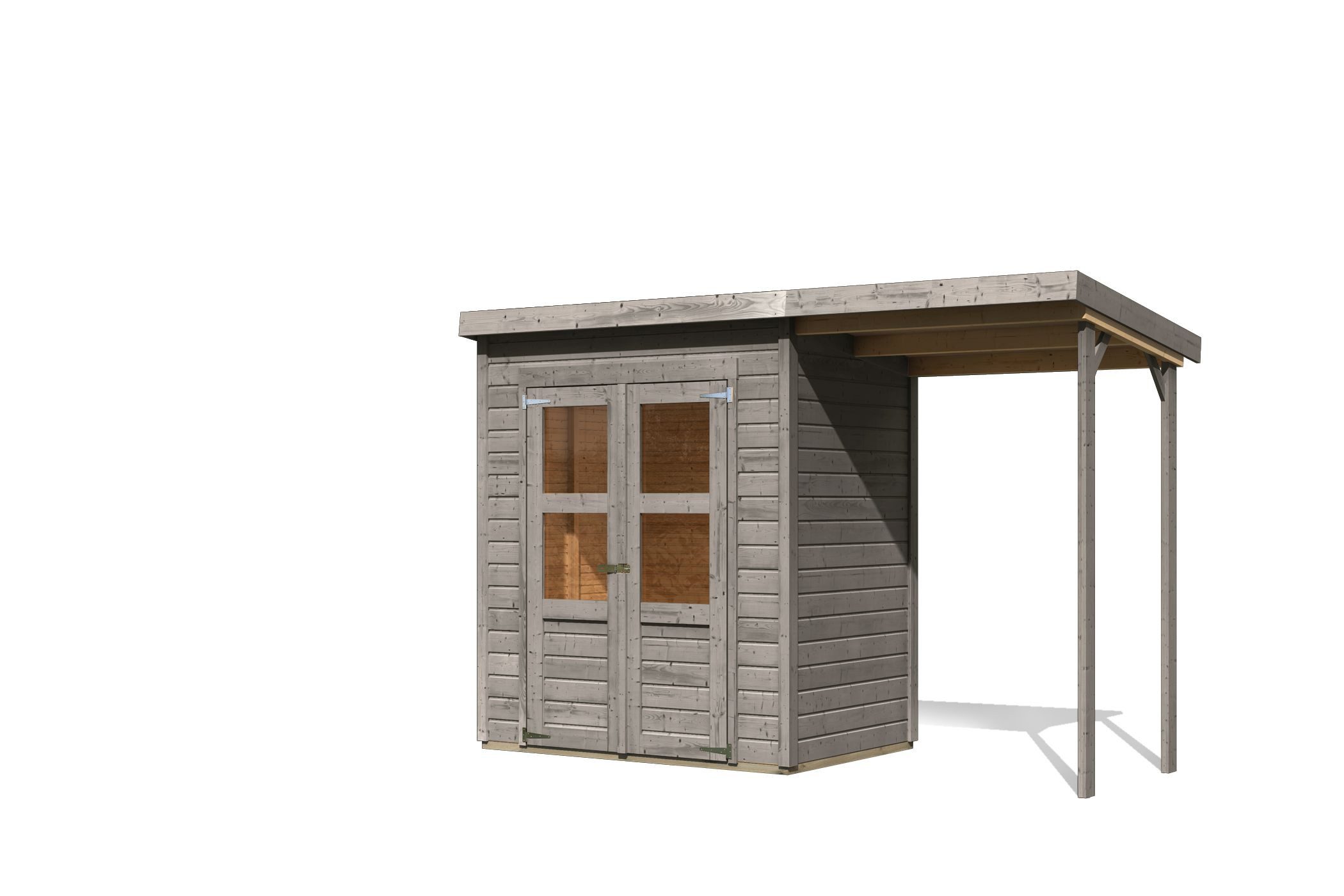 Das Gartenhaus wird aus 14 mm starken Wandbrettern aus nordischer Fichte im Steck-/Schraubsystem gefertigt und gewährleistet somit einen einfachen Aufbau. Das Pultdach besteht aus Dachplatte. Die Grundfläche beträgt 5,02 qm bei einem umbauten Raum von 10 cbm. Mit einer Seitenhöhe von 185 cm und einer Firsthöhe von 219 cm bietet das Gerätehaus optimale Raumnutzung. Das Gartenhaus ohne Anbauten hat ein Sockelmaß von 238 cm x 210 cm. Bodenbalken sorgen für den Schutz von unten und werden unter das Gartenhaus gelegt. Durch die Kesseldruckimprägnierung der Bodenbalken sind diese vor Witterungseinflüssen und holzzersetzenden Pilzen bereits geschützt. Die praktische und vormontierte Tür sorgt mit ihren großzügigen Abmessungen und dem Massivholzrahmen für einen einfachen Zutritt in das Gartenhaus und sichert den Inhalt nebenbei effektiv vor unbefugtem Zugriff. Die Verglasung der Lichtausschnitte sorgt für großzügigen Tageslichteinfall.
