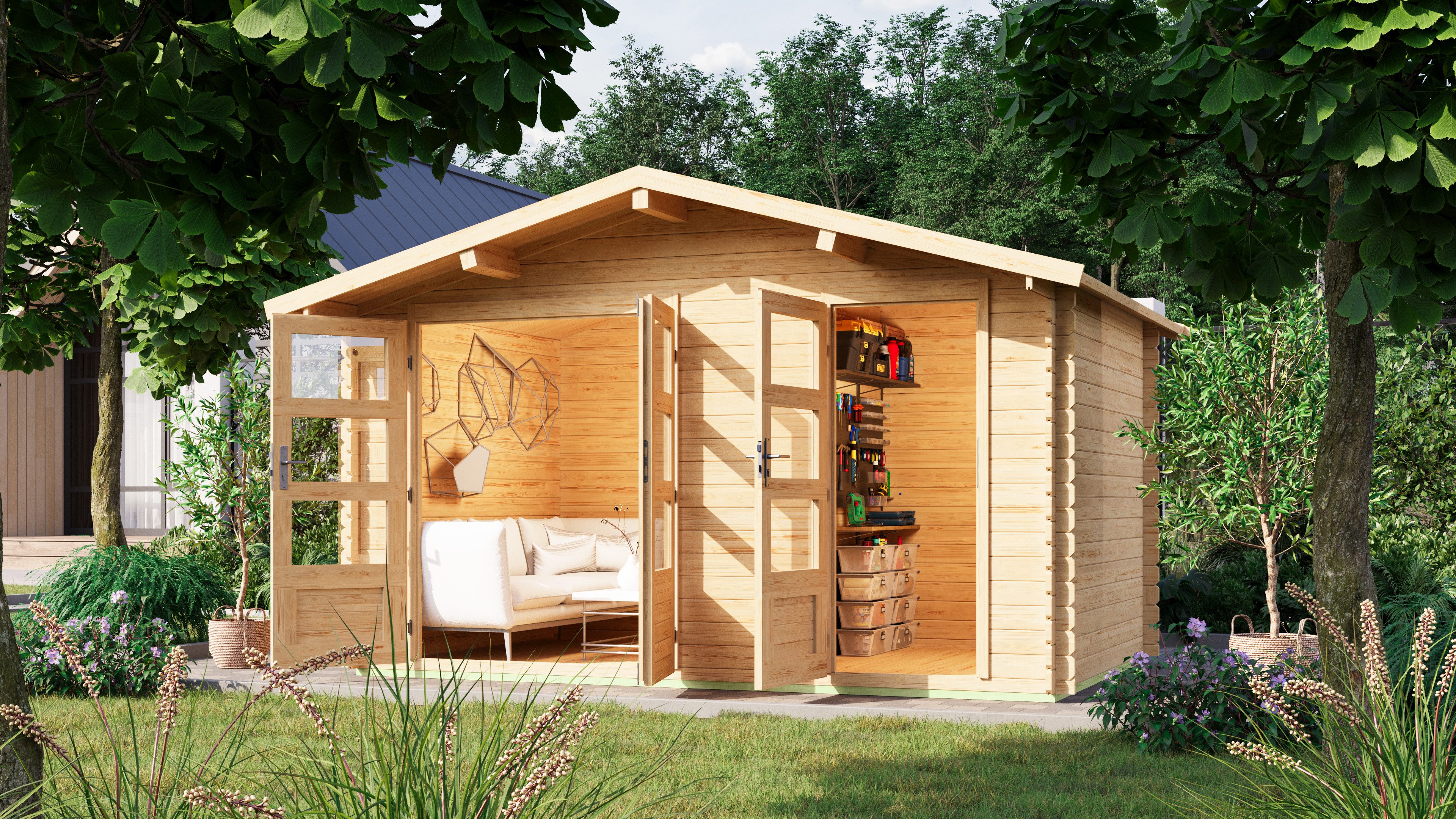 Das Blockbohlenhaus wird aus 28 mm starken Wandbohlen aus nordischer Fichte in klassischer Bockbohlenbauweise gefertigt und gewährleistet somit einen einfachen Aufbau und eine sehr stabile Konstruktion. Bei dieser Bauweise werden die Wandbohlen reihum aufgestapelt, beginnend mit einer halben Bohle für eine glatte und stabile Auflage, und dann miteinander verschraubt. Unsere patentierte 6-Plus-Eckverbindung garantiert eine sehr hohe Regen- und Winddichte. Die in den Eckverbindungen sitzenden Vorbohrungen für die Verschraubung der Blockbohlen sind werkseitig vorgefertigt und verkürzen die Dauer der Montage enorm. Das Satteldach besteht aus Massivholz. Der vordere Dachüberstand von 490 mm schützt den Eingangsbereich darüber hinaus wirkungsvoll. Die Grundfläche beträgt 8,73 qm bei einem umbauten Raum von 18,80 cbm. Mit einer Seitenhöhe von 193 cm und einer Firsthöhe von 247 cm bietet das Gerätehaus optimale Raumnutzung. Das Gartenhaus ohne Anbauten hat ein Sockelmaß von 370 cm x 236 cm. Bei den Blockbohlenhäusern kommt hierzu noch das Maß der überstehenden Blockbohlenköpfe. Bodenbalken sorgen für den Schutz von unten und werden unter das Gartenhaus gelegt. Durch die Kesseldruckimprägnierung der Bodenbalken sind diese vor Witterungseinflüssen und holzzersetzenden Pilzen bereits geschützt. Die praktische und vormontierte Tür sorgt mit Ihren großzügigen Abmessungen und dem Massivholzrahmen für einen einfachen Zutritt in das Gartenhaus und sichert den Inhalt nebenbei effektiv vor unbefugtem Zugriff. Die Verglasung der Lichtausschnitte sorgt für großzügigen Tageslichteinfall.