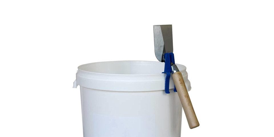 INNOVATIVES WERKZEUG: Die Karl Dahm Eimerkralle erleichtert die Arbeit mit Eimern und Kellen – einfach die Kelle nach Gebrauch sicher in die Halterung legen.