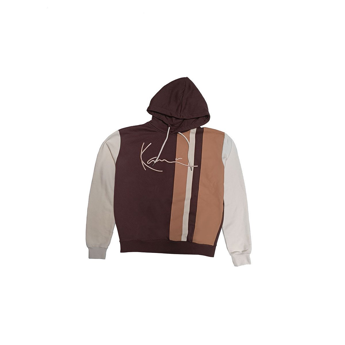 Der Karl Kani Signature Stripe Block Hoodie in den Farben Braun, Sand und Creme besticht durch sein auffälliges Block-Design und eine entspannte Passform. Das Highlight ist die Kani-Signatur auf der Vorderseite, die diesem Hoodie einen einzigartigen Streetwear-Stil verleiht. Ein absolutes Must-Have für Komfort und Stil.