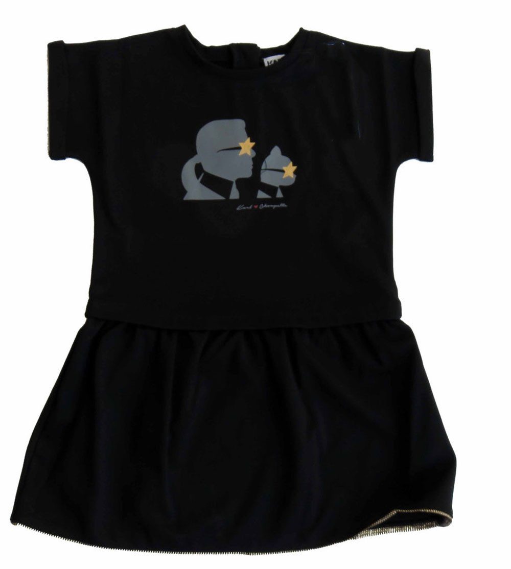 ChatGPT Elegantes Designer-Kleid von Karl Lagerfeld Kids in klassischem Schwarz, perfekt für stilbewusste Kids. Der coole Print von Karl und Choupette wird durch funkelnde, goldene Sternchen ergänzt. Das Kleid überzeugt mit Details wie einem praktischen Reißverschluss hinten, kurzen umgeschlagenen Ärmeln und einer dekorativen Borte in Reißverschluss-Optik am Saum. Hergestellt aus hochwertigem Milano Jersey mit 75 % Polyester, 20 % Viskose und 5 % Elasthan – ein echtes Must-have für jede kleine Fashionista!