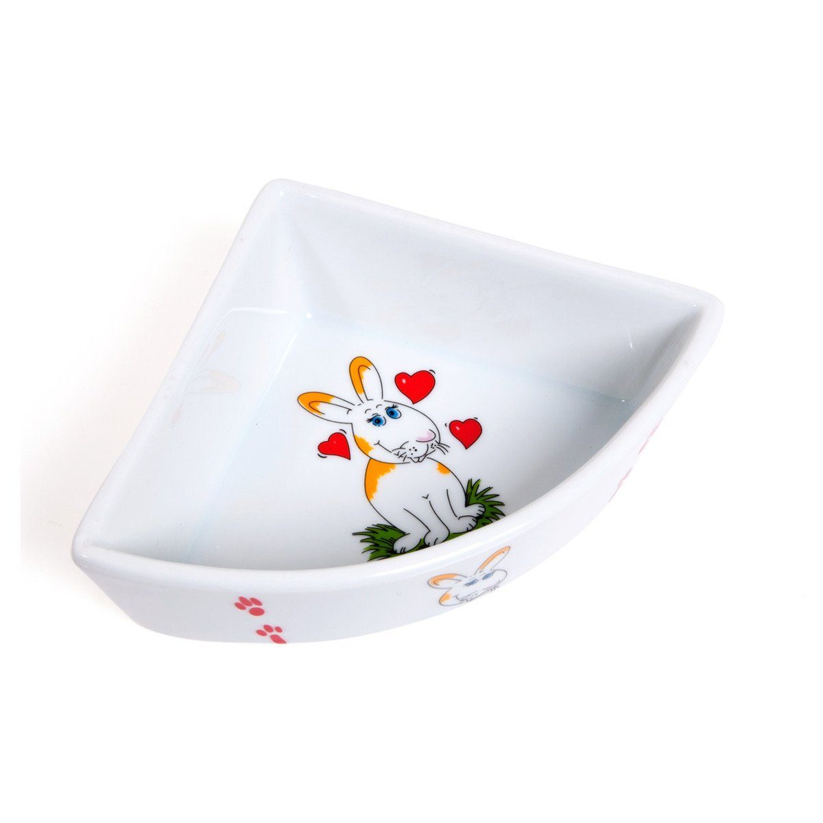 Weißer Eckkeramiknapf mit lustigem Motiv für Hasen. Für eine platzsparende Platzierung in einer Ecke. Einfach zu reinigen.