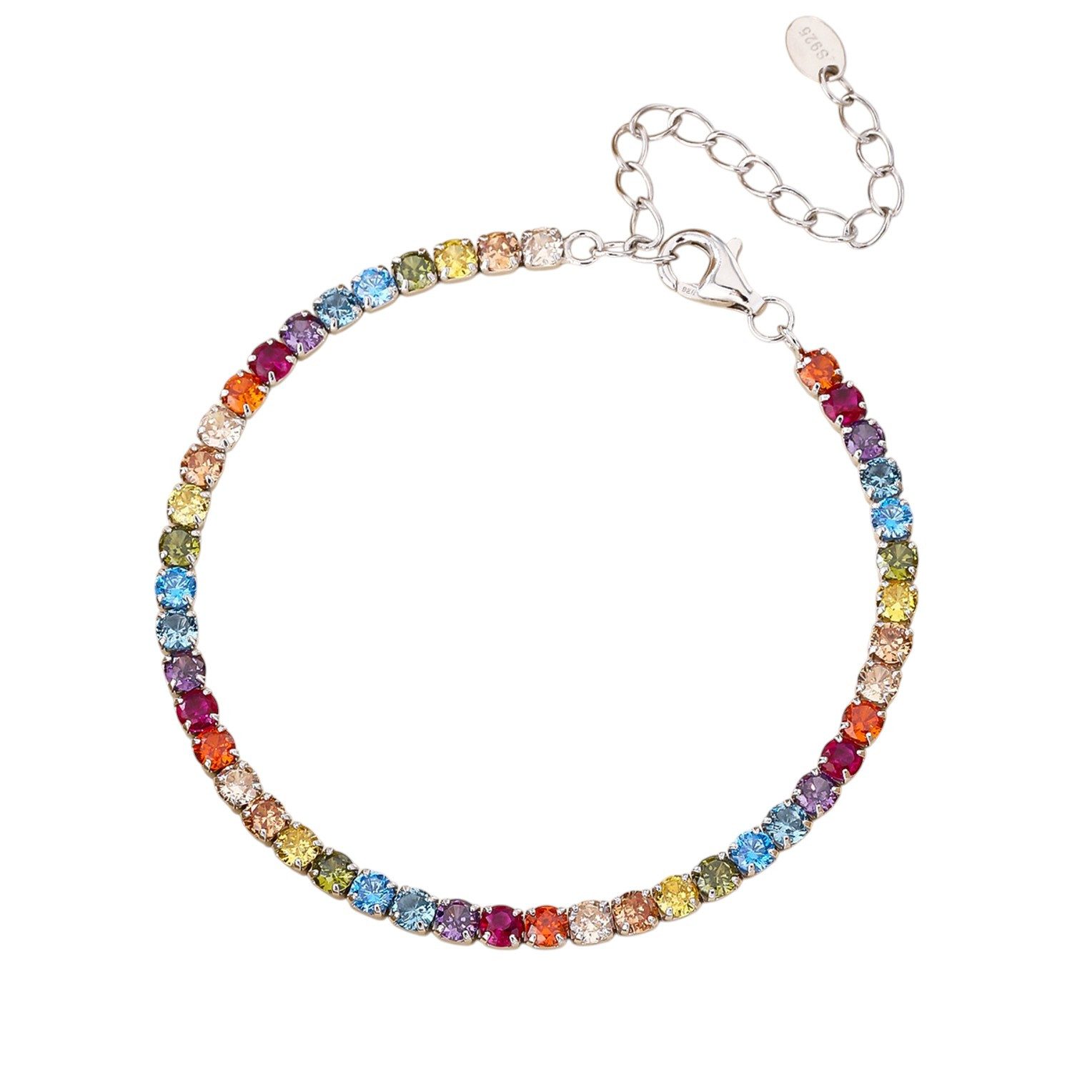 Farbenfrohe Zirkonia in perfekter Anordnung sorgen für einen stilvollen Akzent am Handgelenk und lassen sich vielseitig zu verschiedenen Outfits kombinieren.