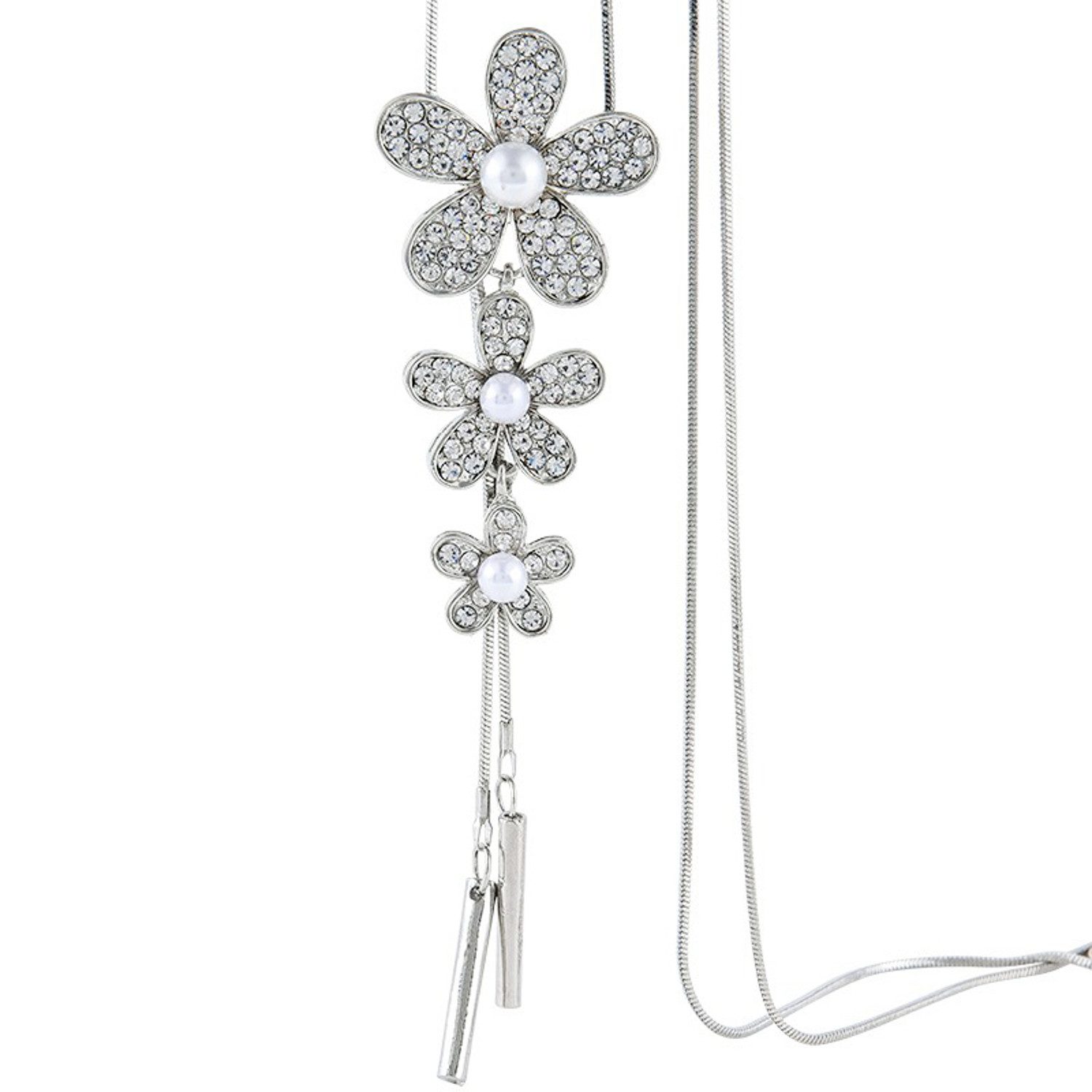 Lange Damenhalskette aus silberfarbener Legierung mit funkelndem Blütenanhänger aus Kristallen und Perlendetails.