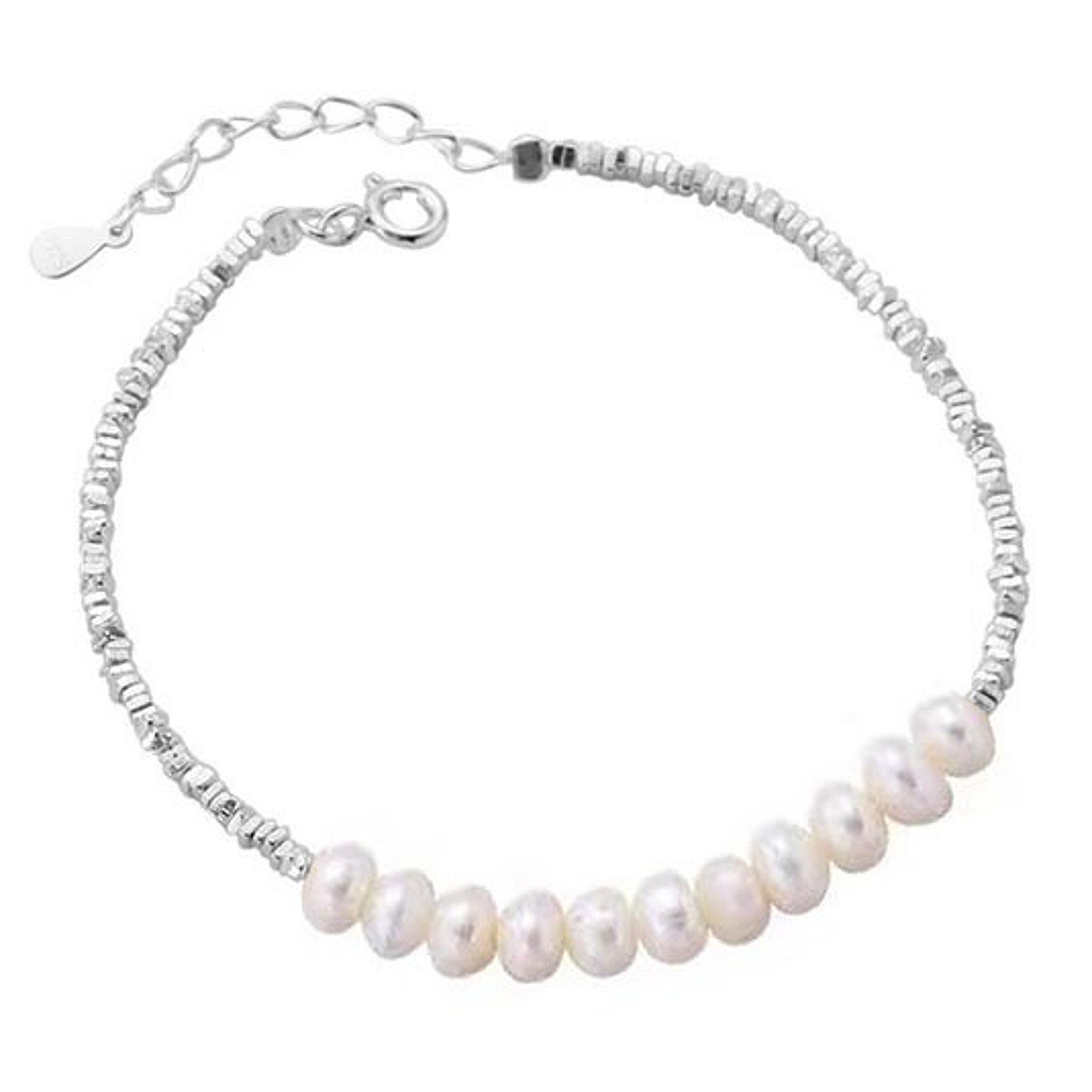 Die zarten, echten Süßwasserperlen reihen sich an eine feine Silberkette und erzeugen einen eleganten Glanz am Handgelenk.