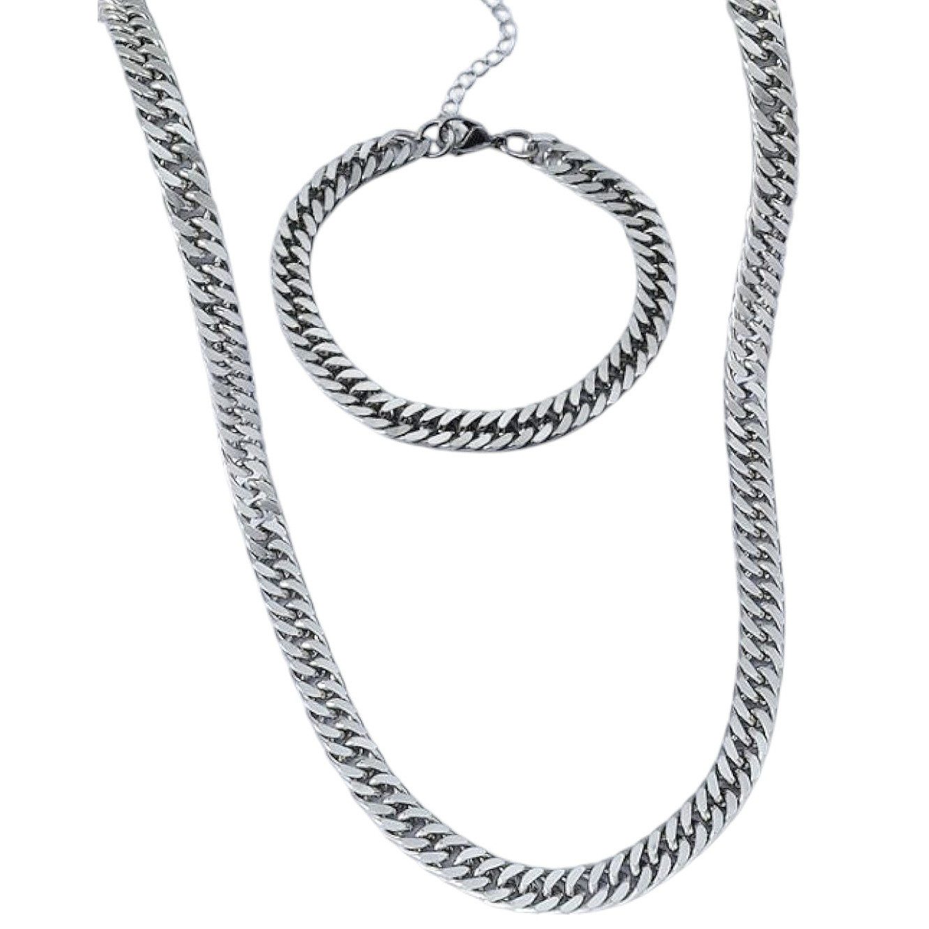 Edles Schmuckset aus hochwertigem, silberfarbenem Edelstahl – stilvolle Panzerkette und passendes Armband für den maskulinen Look im Alltag und bei besonderen Anlässen.
