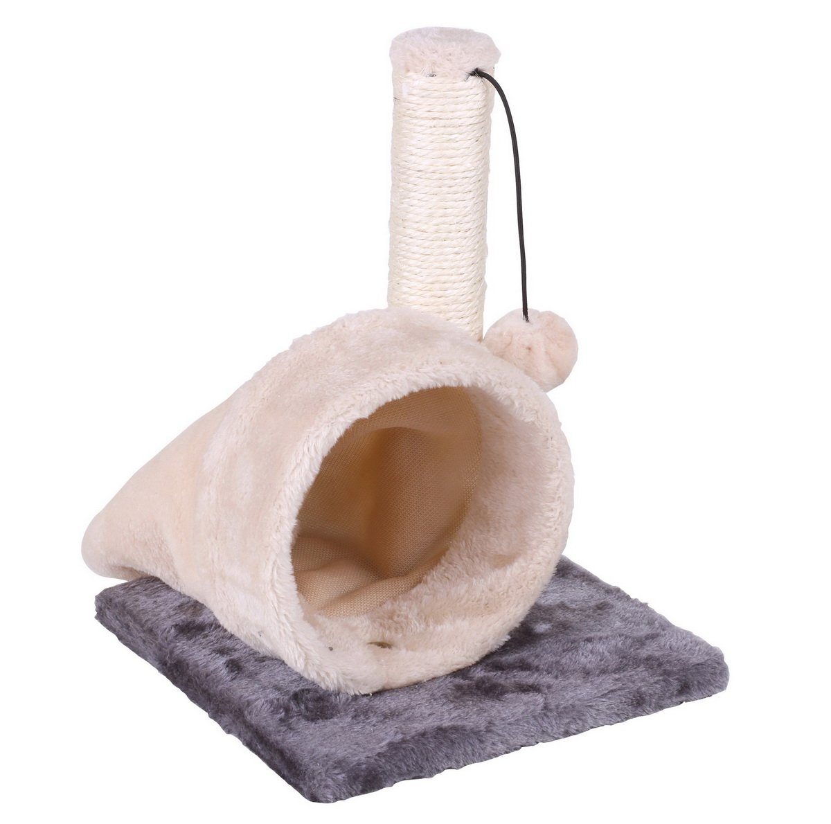 Der Kratzbaum-Pfosten besteht aus Sisal, was perfekt ist, um die Krallen deiner Katze zu schärfen und zu pflegen. Der Tunnel ist aus 100% Polyester und bietet deiner Katze einen sicheren Platz zum Spielen und Verstecken. Der Bommel auf Gummiband wird deine Katze in Bewegung halten und fördert ihre natürlichen Instinkte.