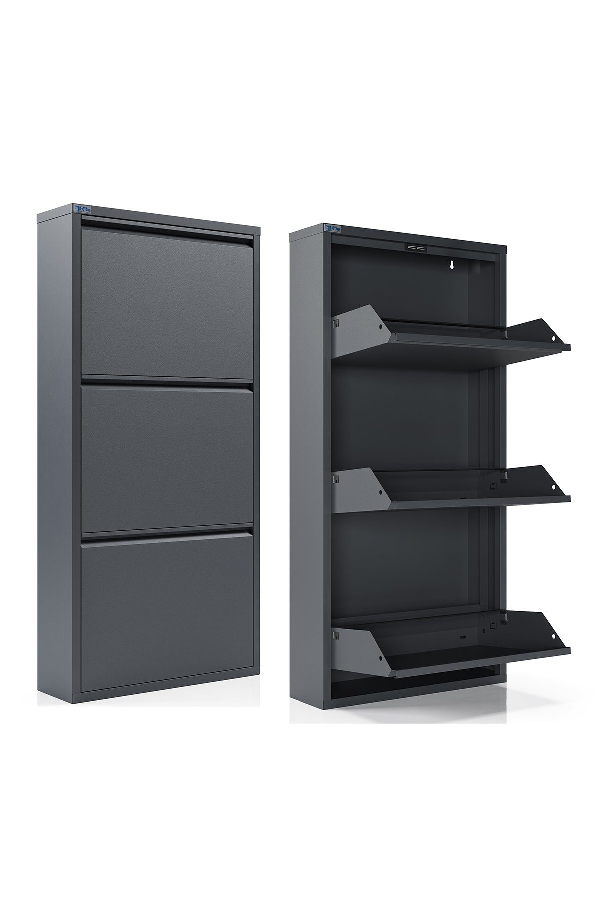 Der Kaufexpress Schuhschrank überzeugt durch sein modernes, schlankes Design und seine hochwertige Metallkonstruktion. Mit einer Tiefe von nur 15 cm passt er selbst in schmale Flure oder Nischen. Je nach Ausführung bietet er 2 bis 5 praktische Klappen, die jeweils Platz für mehrere Paar Schuhe bieten.