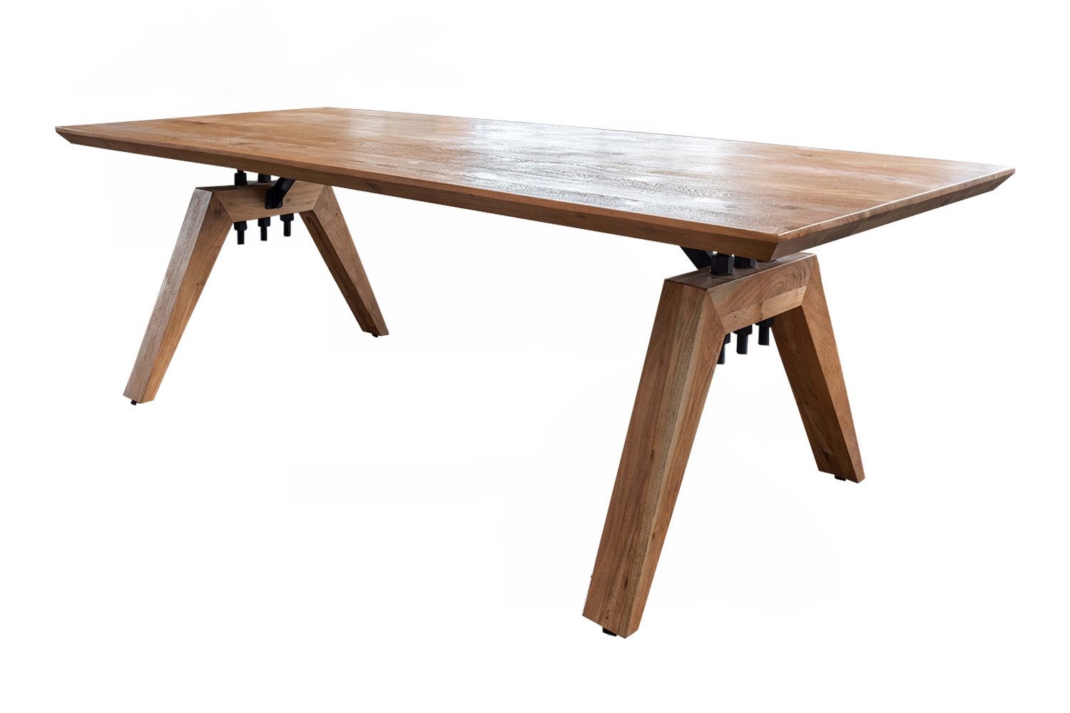 Der Massivholztisch WOODY von KAWOLA vereint markantes Industrial Design mit natürlichen Materialien. Die Oberfläche der Tischplatte aus massivem Akazienholz ist gebürstet und eichefarbig, wodurch die natürliche Holzmaserung perfekt zur Geltung kommt. Besonders hervorzuheben ist die Schweizer Kante, die durch ihre abgeschrägte Form der Platte eine leichte, fast schwebende Wirkung verleiht – ein subtiler, aber effektvoller Hingucker. Das rustikal geschweißte, schwarz lackierte Untergestell im Industriedesign verleiht dem Tisch eine moderne, industrielle Note. Diese gelungene Kombination aus natürlichem Holz und robustem Metall macht den Tisch zu einem Design-Highlight in Ihrem Esszimmer. Mit einer Длина von 200 cm bietet der Tisch ausreichend Platz für stilvolle Dinner und gesellige Runden. Der Esstisch WOODY ist die perfekte Wahl für alle, die modernes Design und natürliche Eleganz miteinander verbinden möchten. Ein echtes Highlight für Wohn- und Essbereiche!
