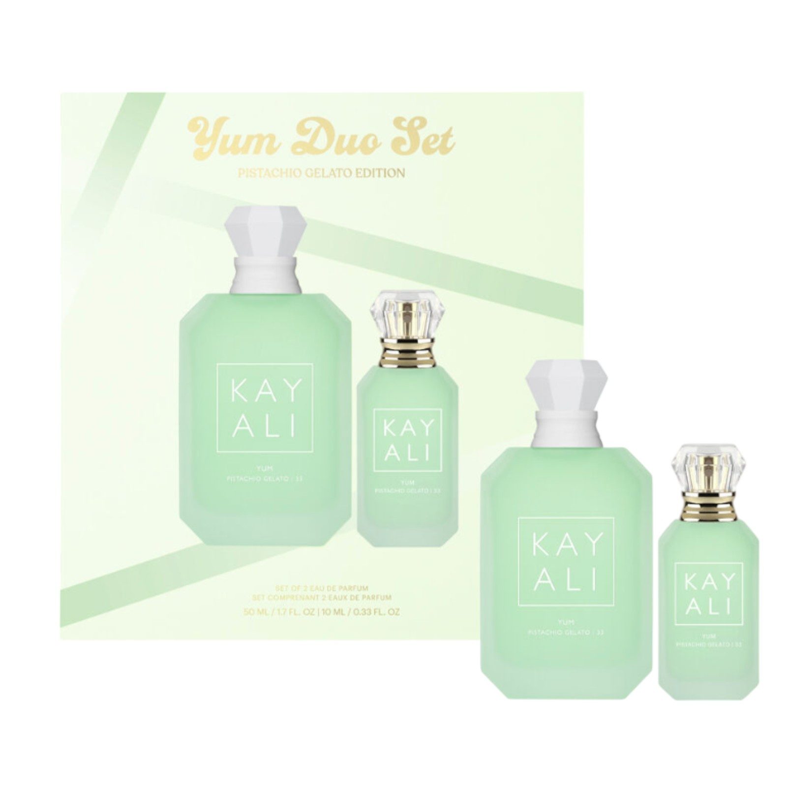 SET-BESCHREIBUNG: Doppelt lecker mit dem KAYALI Yum Duo Set! Dieses limitierte Set enthält Yum Pistachio Gelato | 33 Eau de Parfum Intense, einen leckeren, fröhlichen und unwiderstehlichen Duft, der dich mit jedem Spritzer zum Anbeißen duften lässt. Genieße diesen Duft in zwei Größen: 50 ml für dein Regal und die legendäre 10 ml Deluxe Miniatur zum Auffrischen deines Duftes für unterwegs. ÜBER DEN DUFT: Lecker, fröhlich und unwiderstehlich: KAYALI Yum Pistachio Gelato | 33 Eau de Parfum Intense ist eine köstliche Explosion unwiderstehlicher und essbarer Noten, darunter Pistazie, üppige Schlagsahne, geröstete Haselnuss, süßer Rum, fluffiger Marshmallow und sprudelnde Zuckerwatte ÜBER DIE FLASCHE: Die charakteristischen, rautenförmigen Flakons und opulenten Juwelenverschlüsse von KAYALI sind von traditionellen Oud-Flakons aus dem Nahen Osten inspiriert. Die Zahl gibt die Anzahl der Herstellungsdurchgänge an, die nötig waren, um den perfekten Duft zu kreieren.