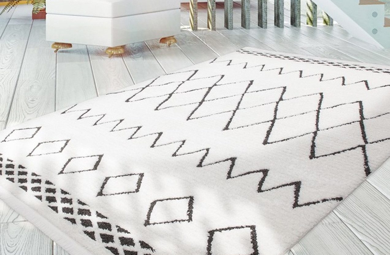 **Hochflorteppich mit Ethno-Design** Bringen Sie mit diesem Hochflorteppich frischen Wind in Ihr Zuhause. Das moderne schwarze Ethno-Muster verziert den hellen Teppich ideal und wird durch die dekorativen und weichen Fransen an den Teppichenden noch unterstrichen. Die schlichten Farben in aufregendem Design aus geometrischen Formen werten nicht nur moderne Einrichtungen auf, sondern auch klassische oder rustikale Wohnstile. Statten Sie Ihre Wohnräume mit Ihrem neuen Hochflorteppich aus und schaffen Sie eine gemütliche Atmosphäre, egal ob in Wohnzimmer, Schlafzimmer oder Eingangsbereich. Mit modernen Teppichen von Kayoom holen Sie sich Blickfänge nach Hause. Damit für jede Wohnsituation ein passendes Exemplar dabei ist, ist der Teppich in verschiedenen Größen erhältlich. Der robuste und strapazierfähige Teppich lässt sich durch den Material-Mix aus Polypropylen (70 %) und Polyester (30 %) auch in viel genutzten Wohnbereichen gut auslegen.