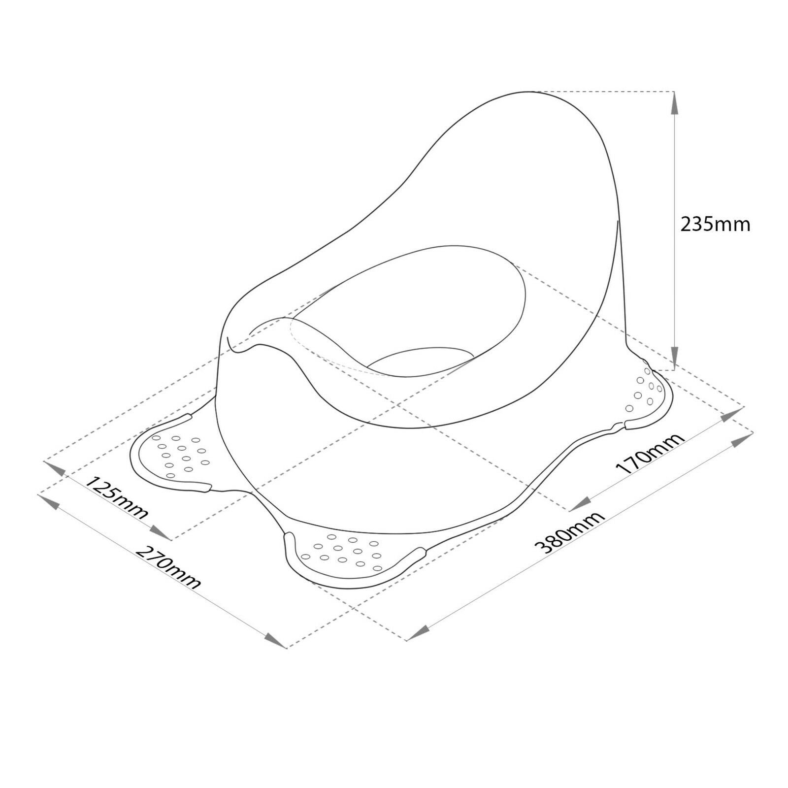 Anatomisch geformt mit ergonomischem Design: optimale Sitzhöhe, hohe Rückenlehne, breite Sitzfläche, Spritzschutz, Hygienische Anwendung dank der Griffmulde im Rücken.