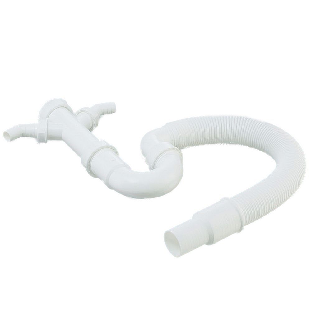 Röhrensiphon 1,5 Zoll (Standard) inkl. Dichtungen mit einem flexiblem Schlauch zum Wandablauf und zwei zusätzlichen Geräteanschlüssen am Spülenablauf zum Anschluss von Waschmaschine oder Spülmaschine. Für nicht benötigte Geräteanschlüsse werden zwei Geruchsverschlüsse mitgeliefert.