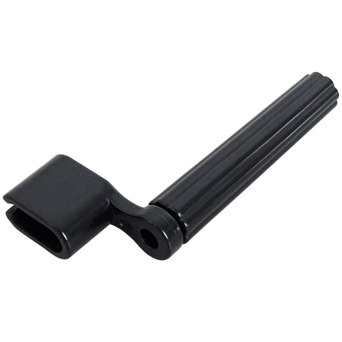 Die Kurbel ist aus Kunststoff gefertigt und hat einen 80mm langen Griff. Am Kopfende der Saitenkurbel, wo die Stimm-Mechanik angesetzt wird, befindet sich eine Aussparung mit deren Hilfe die Steg-Stifte aus den meisten Westerngitarren-Modellen bequem herausgezogen werden können.