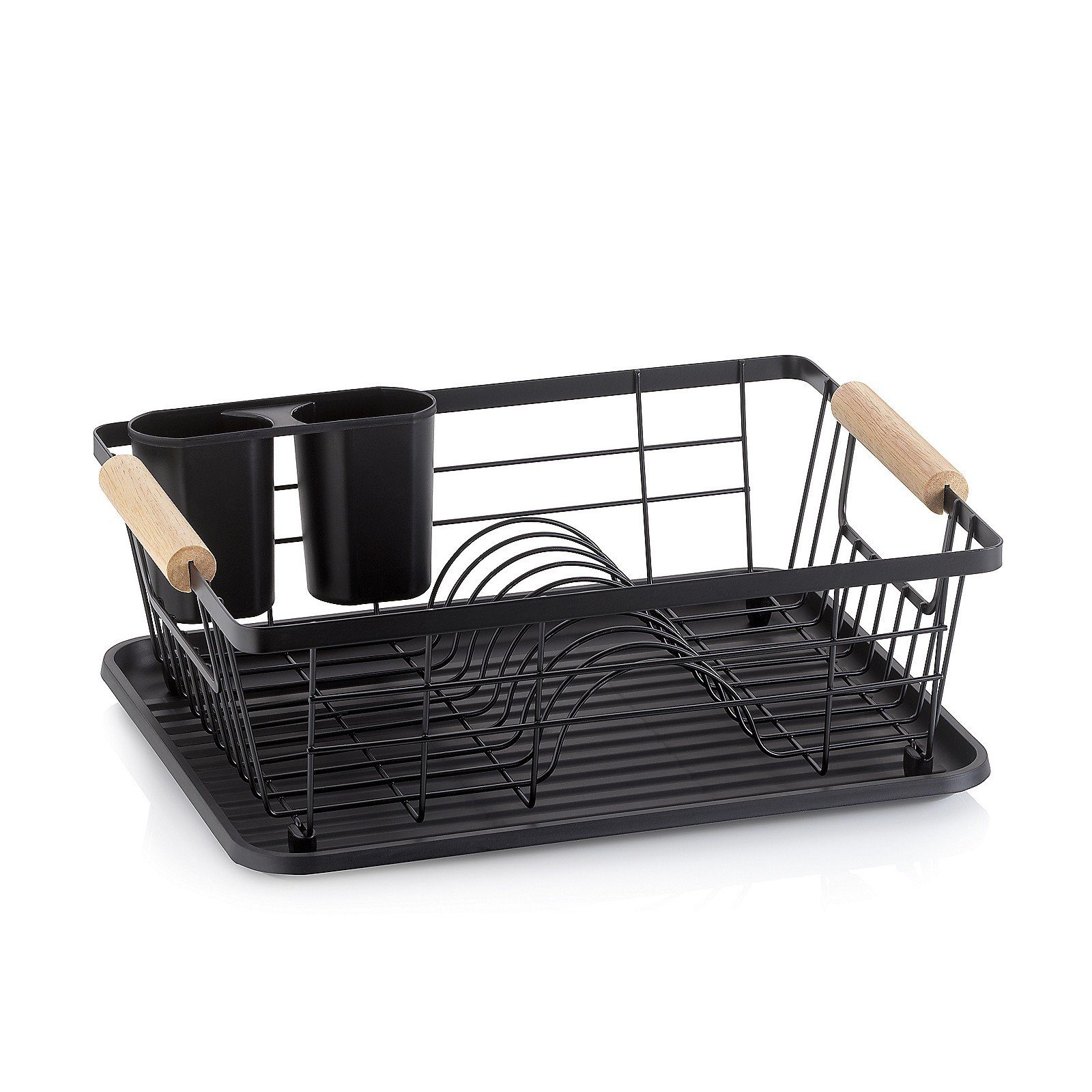 Schöner, schwarzer Geschirrabtropfkorb Rica aus Metall inklusive Kunststoffsteller für das sich sammelnde Abtropfwasser und 2 Besteckhalter aus Kunststoff. Ideales Accessoire, um das Geschirr praktisch an der Luft trocknen zu lassen. Maße: 42 x 31,5 x 15 cm.